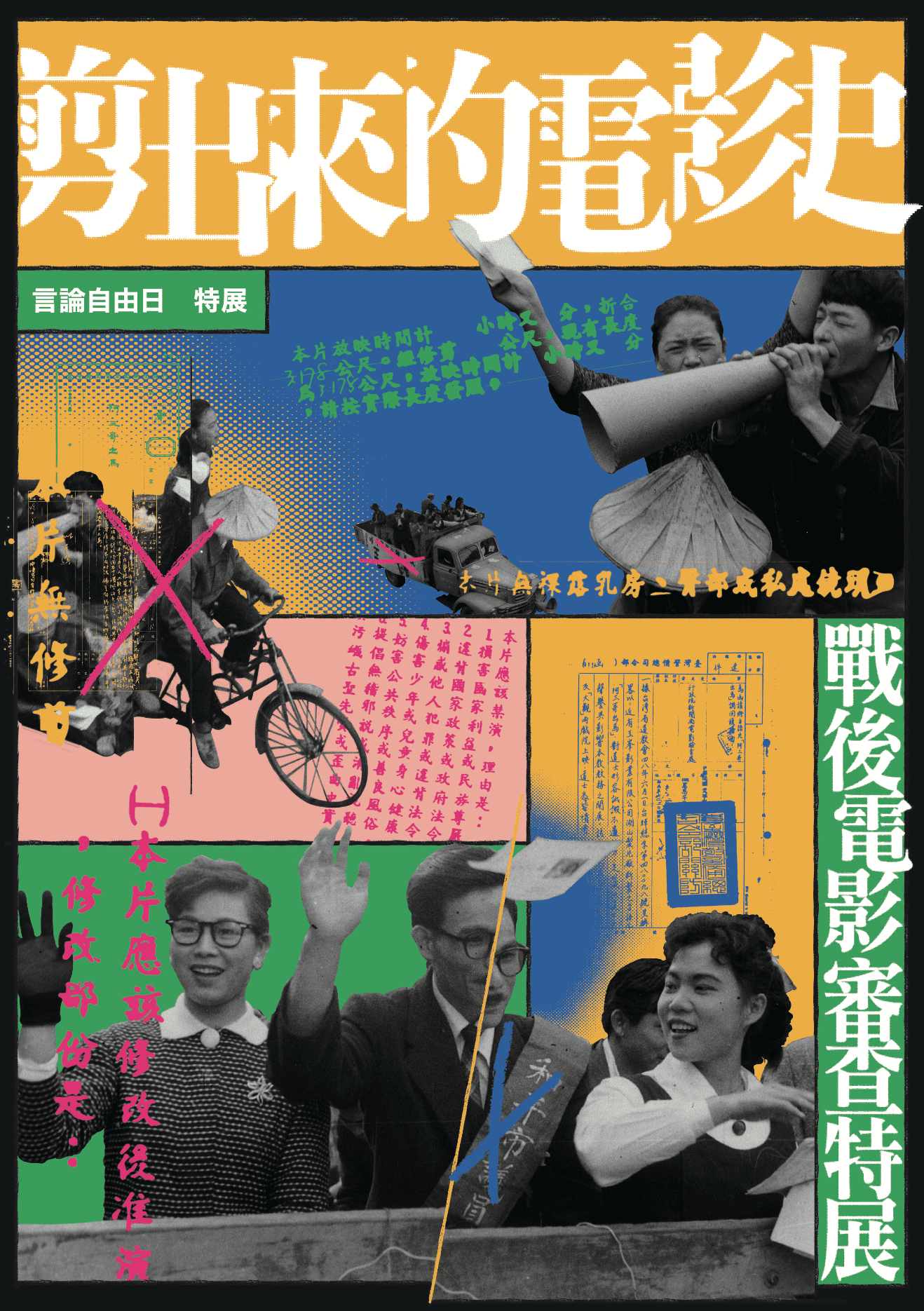 言論自由是一種人權。然而,這種自由得來並不容易。曾經,電影在臺灣上映必須經過審查。有些題材,我們沒得看、禁止拍、不敢想。許多外國電影在臺上映,觀眾看到的是卻是畫面噴霧或塗黑,甚至對白和劇情直接被刪改的版本。本特展將回顧戰後臺灣「無所不檢」的電影審查,一同省思:讓我們「言論不自由」的審查體制,究竟是什麼樣貌?威權政府禁止過什麼片上映?生活在審查體制下的臺灣人如何因應?我們又是如何一步步邁向言論自由的?讓我們從本特展出發,一起以電影為度,思索言論自由的本質與界線,喚醒對於「審查時刻」的敏感,解開曾經因審查體制鎖住的視野與心靈。