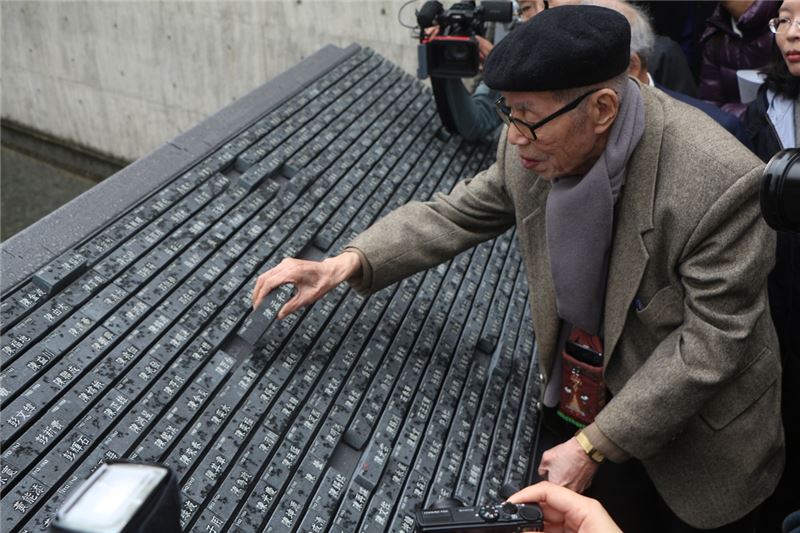 巡禮時,長輩們不斷在密密麻麻的受難者名單中,尋找認識難友的名字。當初發動倡議設計紀念碑的五十年代白色恐怖案件平反促進會前會長吳聲潤,就在紀念碑槍決區尋找同案難友。微雨中,吳聲潤前輩找到了刻有張萬枝、傅慶華1951年被槍決的碑石,當場忍不住掩面放聲大哭:「傅慶華,我來看你了…」,滿是闊別半世紀來的感傷,令現場人士動容。