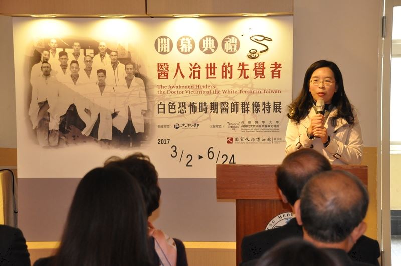 今日的開幕典禮,國家人權博物館籌備處王信惠副主任、高雄醫學大學劉景寬校長、臺灣醫學史學會張秀蓉理事長等皆蒞臨。王信惠副主任表示,「醫人治世的先覺者—白色恐怖時期醫生群像特展」,透過判決書、史料和當事人及家屬提供的口述歷史、文物,重新還原歷史原貌;並展出105位受難醫師、醫學生、醫事人員的完整名單,為他們遭受的不白冤屈平反。於人權館景美人權文化園區首展後獲得熱烈迴響,很高興有機會與高雄醫學大學共同合作,共同戮力推動人權教育。