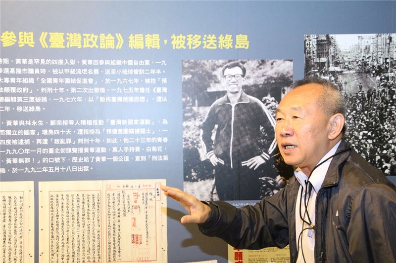 戒嚴期間4度遭到逮捕坐牢的政治受難者黃華前輩,4日上午出席景美人權文化園區「與前輩有約」活動,向來自全臺各地的大專院校青年學子、博物館志工,講述自己苦讀自修受自由主義啟蒙、反對國民黨一黨專政的政治主張,並重返當年警總景美看守所的軍事法庭、關押牢房,回憶失去自由的獄中遭遇。