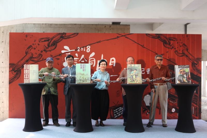 接著則由文化部丁曉菁次長、陳俊宏館長、政治受難者郭振純前輩,以及藏書家石文傑及鄭南榕基金會董事曹欽榮先生共同斷開象徵箝制思想與言論自由的鎖鍊,為「2018言論自由日─噤聲的日常」特展正式拉開序幕。