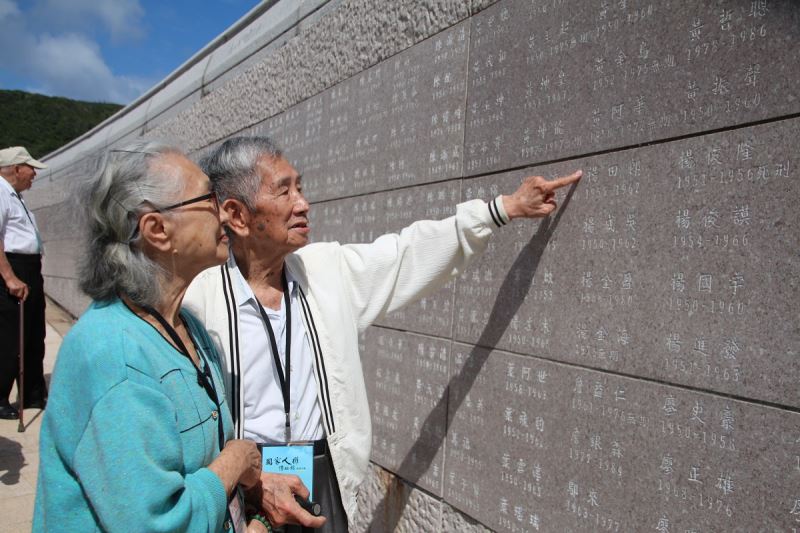 高齡92歲政治受難者楊貴標先生,指著綠島人權紀念碑上的同案難友楊田郎名字