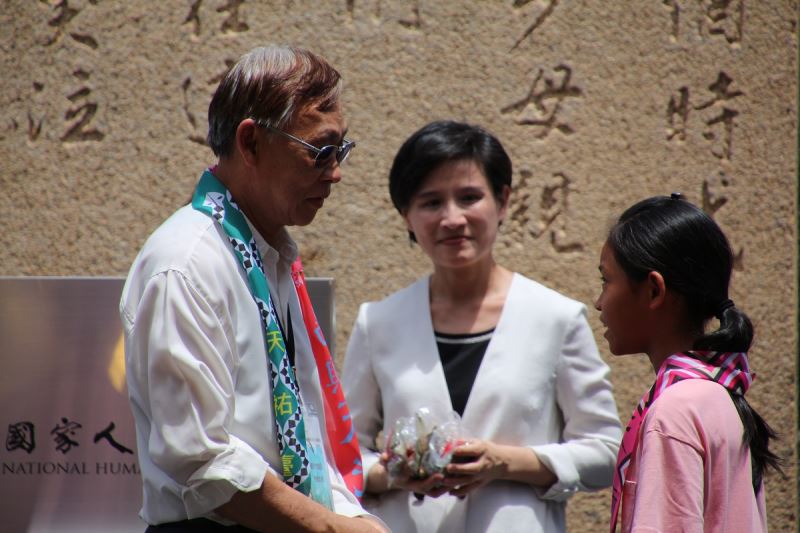 政治受難者前輩陳欽生(左)將人權彩飄親手掛在綠島公館國小學童身上
