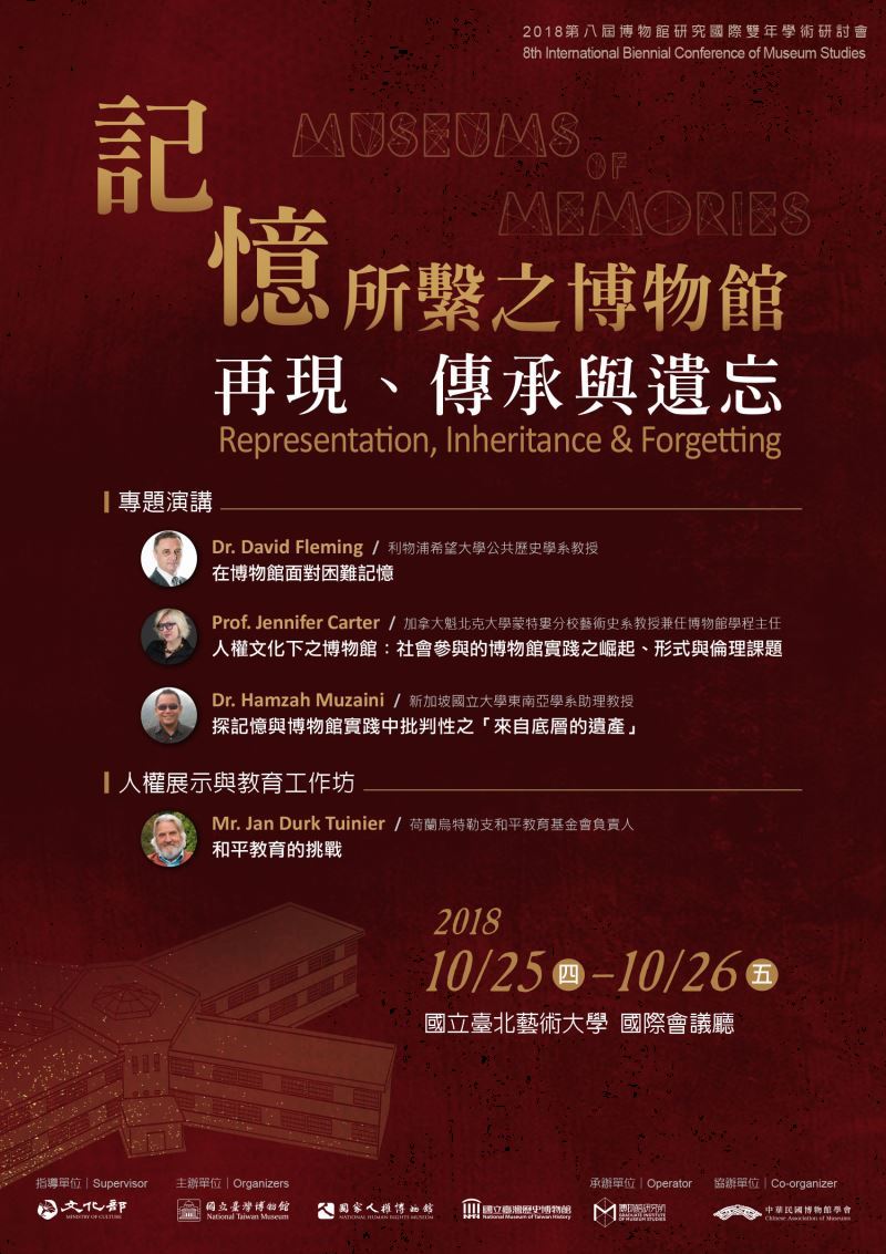 本屆大會特別邀請前英國國立利物浦博物館總館長David Fleming、新加坡國立大學東南亞學系Hamzah Muzaini博士,及加拿大魁北克大學蒙特婁分校博物館學程主任Jennifer Carter三位學者,以「在博物館面對困難記憶」、「探記憶與博物館實踐中批判性之『來自底層的遺產』」及「人權文化下之博物館:社會參與的博物館實踐之崛起、形式與倫理課題」為主題,進行專題演講。10月25日下午則有來自荷蘭烏特勒支和平教育基金會負責人Jan Durk Tuinier,於國家人權博物館進行博物館人權展示與教育工作坊,以人權教育工作者為對象,透過提問與分組討論的方式,探討和平與人權教育的基本理念與實踐方法。歡迎博物館與文化資產學術界、實務界、投身人權與和平教育議題之先進及工作者參與盛會。