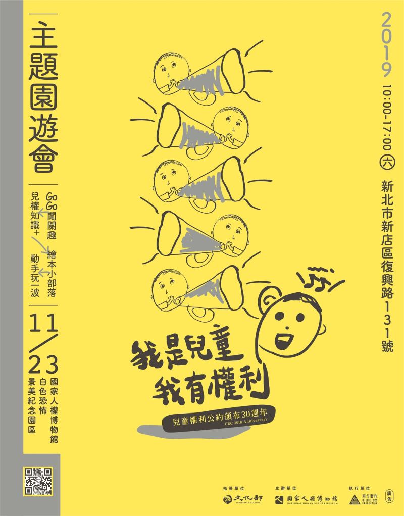 2019年適逢聯合國兒童權利公約頒布30週年,我國亦於2014年將公約納入國內法,然而對大多數國人來說「兒童權利」似乎難以跟日常生活連結實踐。為了讓大眾了解更多公約的內容與精神,國家人權博物館將於11月20日「世界兒童日」推出「我是兒童,我有權利」兒童權利公約頒布30週年主題特展、11月23日推出以「兒少」為主角的「兒童權利公約頒布30週年主題園遊會」。主題園遊會將由兒童擔任人權館小小解說員,帶領民眾以另一種眼光與想像認識白色恐怖景美園區,「小小人權解說員工作坊」於11月16日、17日舉辦,11月1日上午10時起開放報名,歡迎踴躍參與。