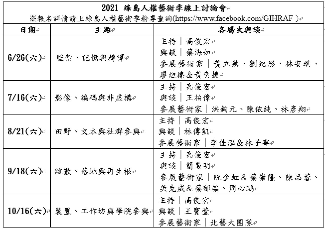 自6月26日起,策展人高俊宏以五大主題梳理今年綠島人權藝術季的內容,邀請參展藝術家以線上分享從登島場勘、與受難者前輩共識會議,發展出全新創作內容,到佈展完成的心境轉變,每一場線上討論也會邀請藝評人以外部觀察的角度,提出當代藝術做為人權推廣的更多可能,回應在策展主題下所期待的「以島為鏡,以藝術開路。」活動將以google meet進行,報名與相關活動訊息,請上綠島人權藝術季粉絲專頁。