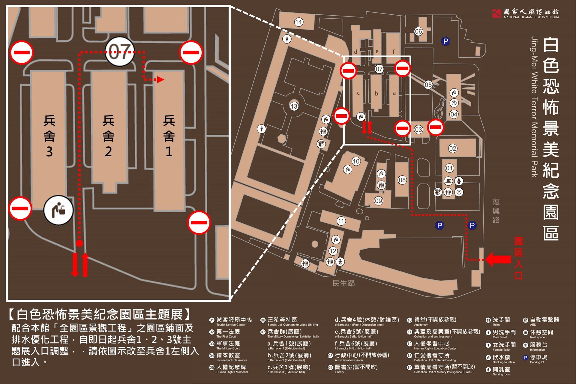 配合本館「全園區景觀工程」之園區鋪面及排水優化工程,自即日起兵舍1、2、3號主題展入口調整,,請依圖示改至兵舍1左側入口進入。