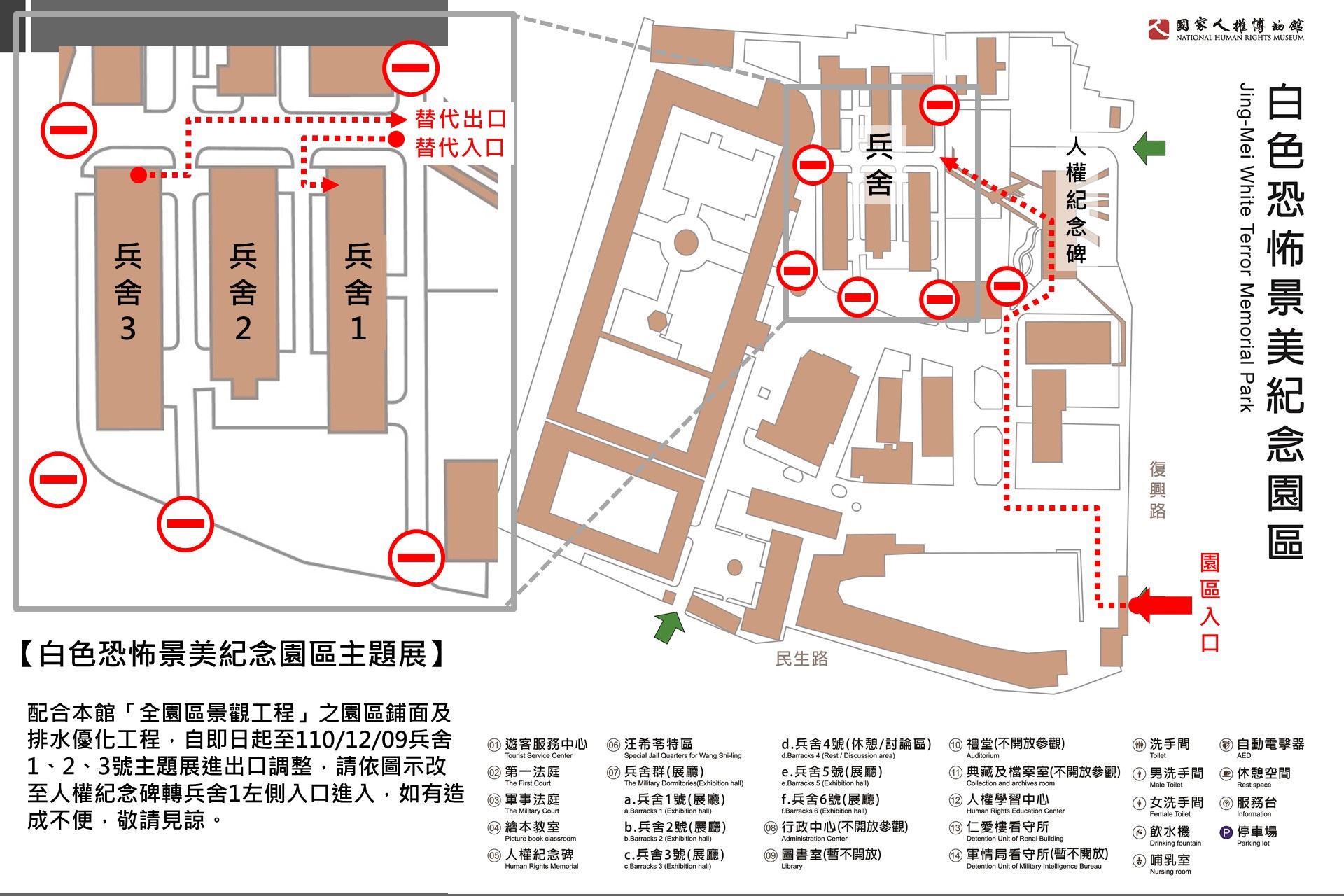 配合本館「全園區景觀工程」之園區鋪面及排水優化工程,自即日起至110/12/09兵舍1、2、3號主題展進出口調整,請依圖示改至人權紀念碑轉兵舍1左側入口進入,如有造成不便,敬請見諒。