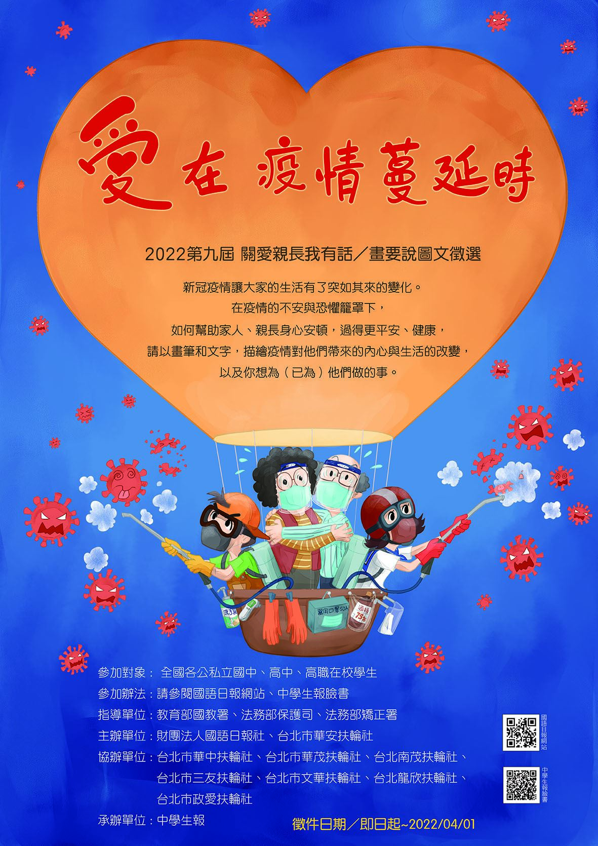 2022第九屆「關愛親長我有話/畫要說:愛在疫情蔓延時」圖文徵選活動徵件時間自即日起至111年4月1日截止收件,歡迎個案子女、同仁子女或適齡之青少年(國中及高中生),踴躍報名參加。有關徵稿活動相關資訊及報名資料下載,請參見國語日報社網站(http://www.mdnkids.com)和「中學生報臉書」。活動簡章、報名表及海報詳如附檔。