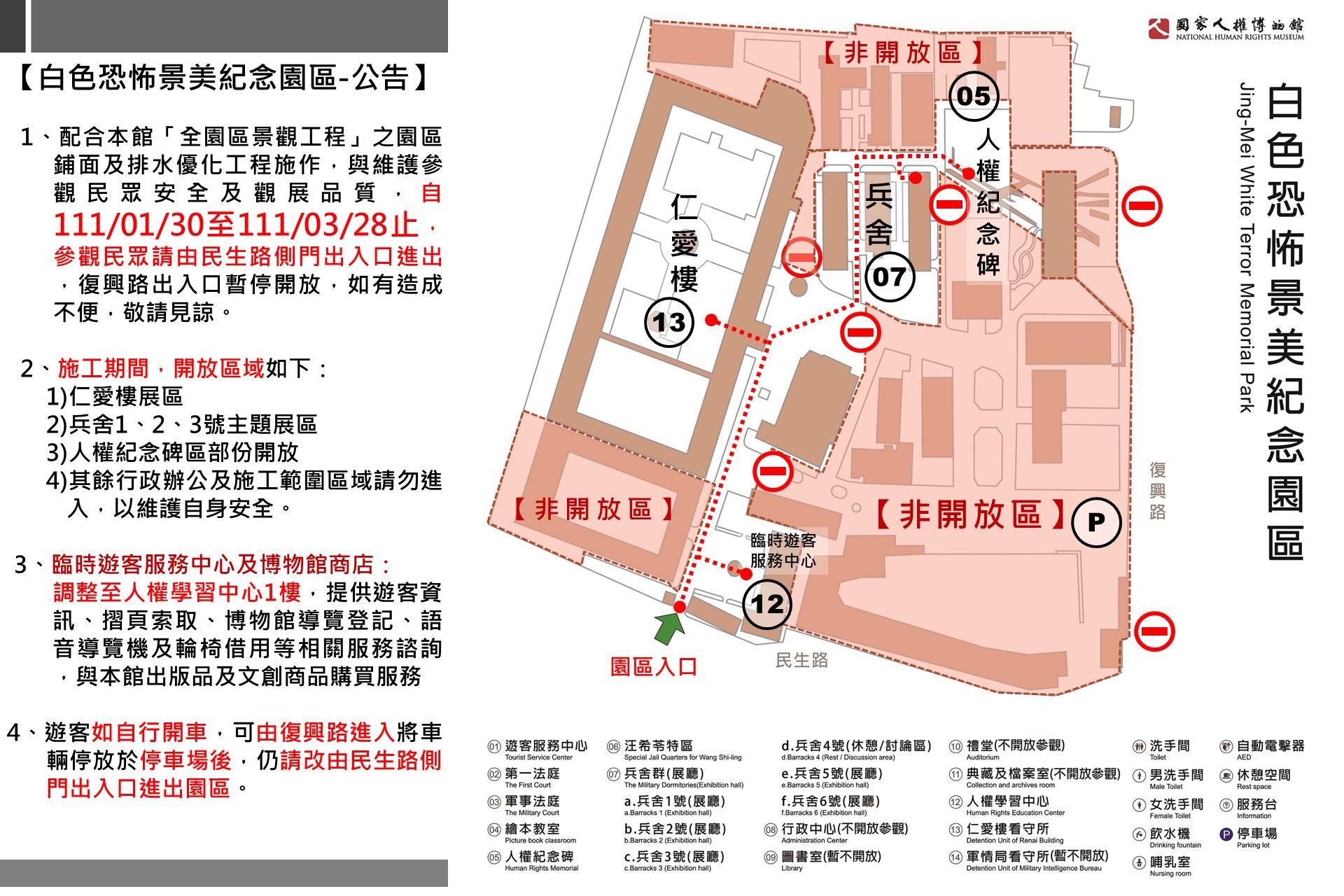 - 配合本館「全園區景觀工程」之園區鋪面及排水優化工程施作,與維護參觀民眾安全及觀展品質,自111/01/31至111/03/28止,參觀民眾請由民生路側門出入口進出,復興路出入口暫停開放,如有造成不便,敬請見諒。