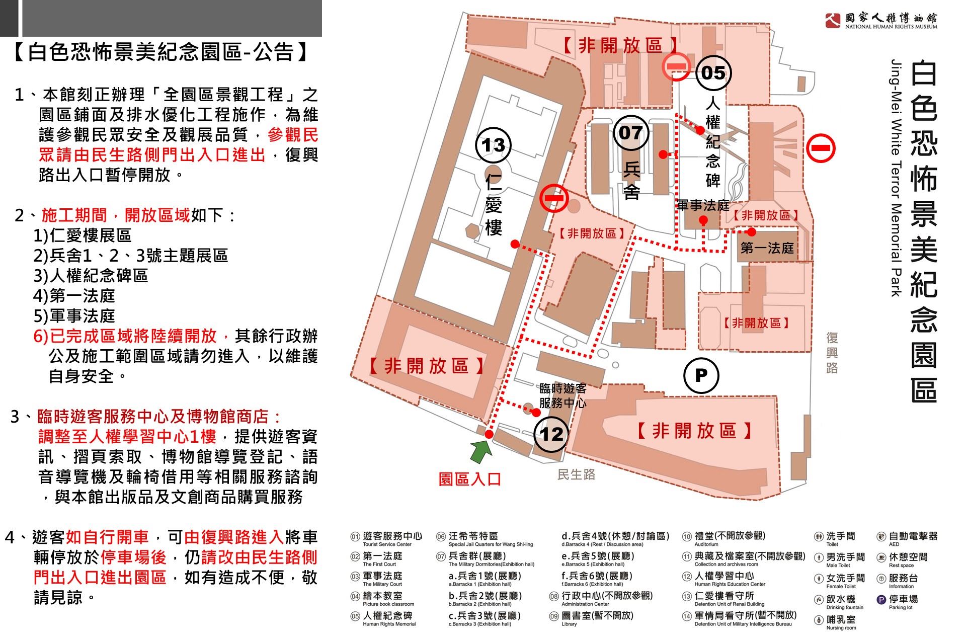 1、本館刻正辦理「全園區景觀工程」之園區鋪面及排水優化工程施作,為維護參觀民眾安全及觀展品質,參觀民眾請由民生路側門出入口進出,復興路出入口暫停開放。