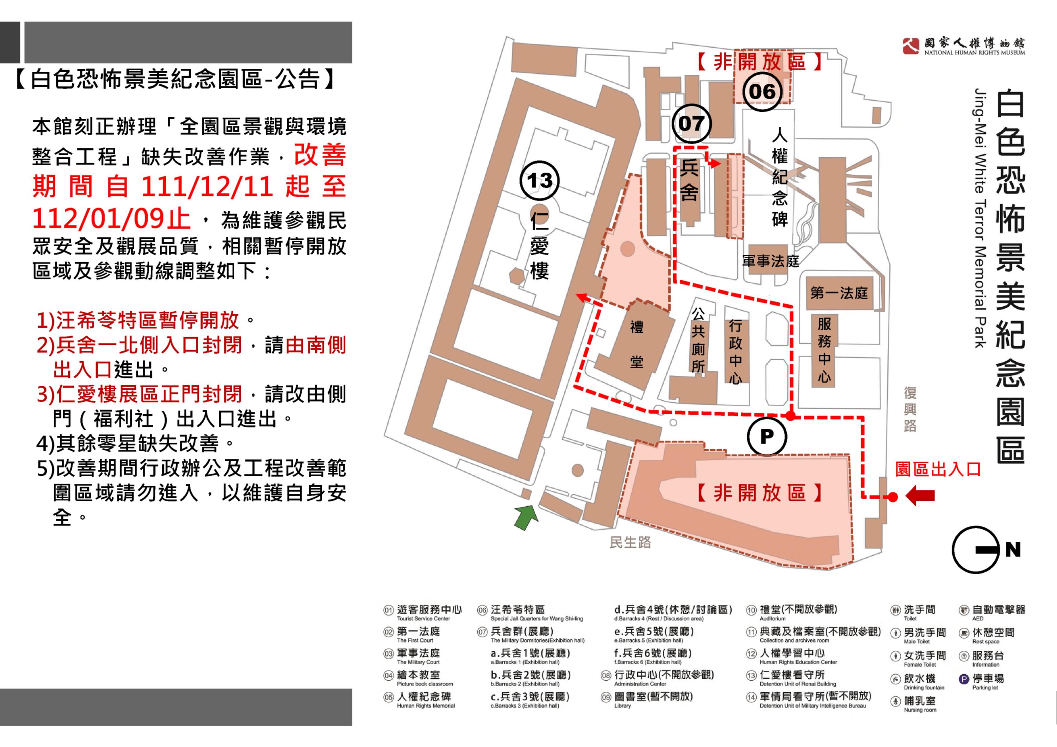 本館刻正辦理「全園區景觀與環境整合工程」缺失改善作業,改善期間自111/12/11起至112/01/09止,為維護參觀民眾安全及觀展品質,相關暫停開放區域及參觀動線調整如下: