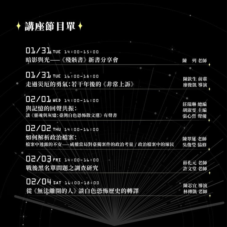 為呼應推廣人權知識與歷史的可能性,人權館展期間特別規劃6場系列講座:由駐館藝術家同時也是政治受難者的散文家陳列,發表直面自身受難經歷的最新力作《殘骸書》,並於書展期間首賣;政治受難者陳欽生前輩與狂想劇場導演廖俊凱對談,分享甫於去年重演的紀錄劇場《非常上訴》的理念與合作過程;春山出版總編莊瑞琳、主編胡淑雯與聲優張心哲帶來《靈魂與灰燼:臺灣白色恐怖散文選》有聲書的發表;臺大歷史系陳翠蓮教授與國史館吳俊瑩協修主講「如何解析政治檔案」;政大臺灣史研究所教授薛化元與臺灣教授協會會長許文堂分享主編《戰後「黑名單」問題之調查研究》專書的點滴;以及邀請《無法離開的人》陳芯宜導演與中山大學社會學系助理教授林傳凱對談白色恐怖歷史的藝術轉譯。