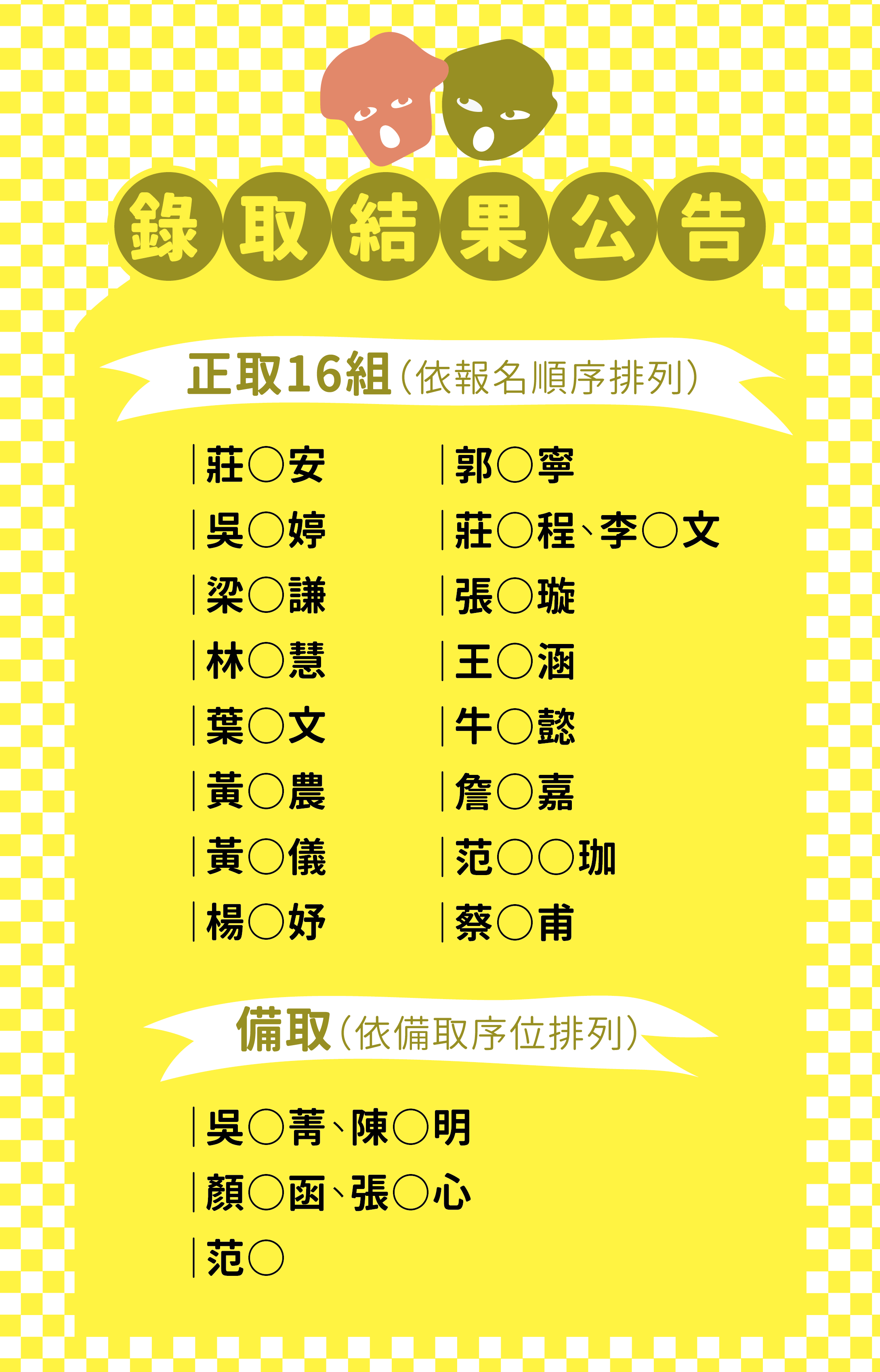 備取1:吳O菁、陳O明 備取2:顏O函、張O心 備取3:范O