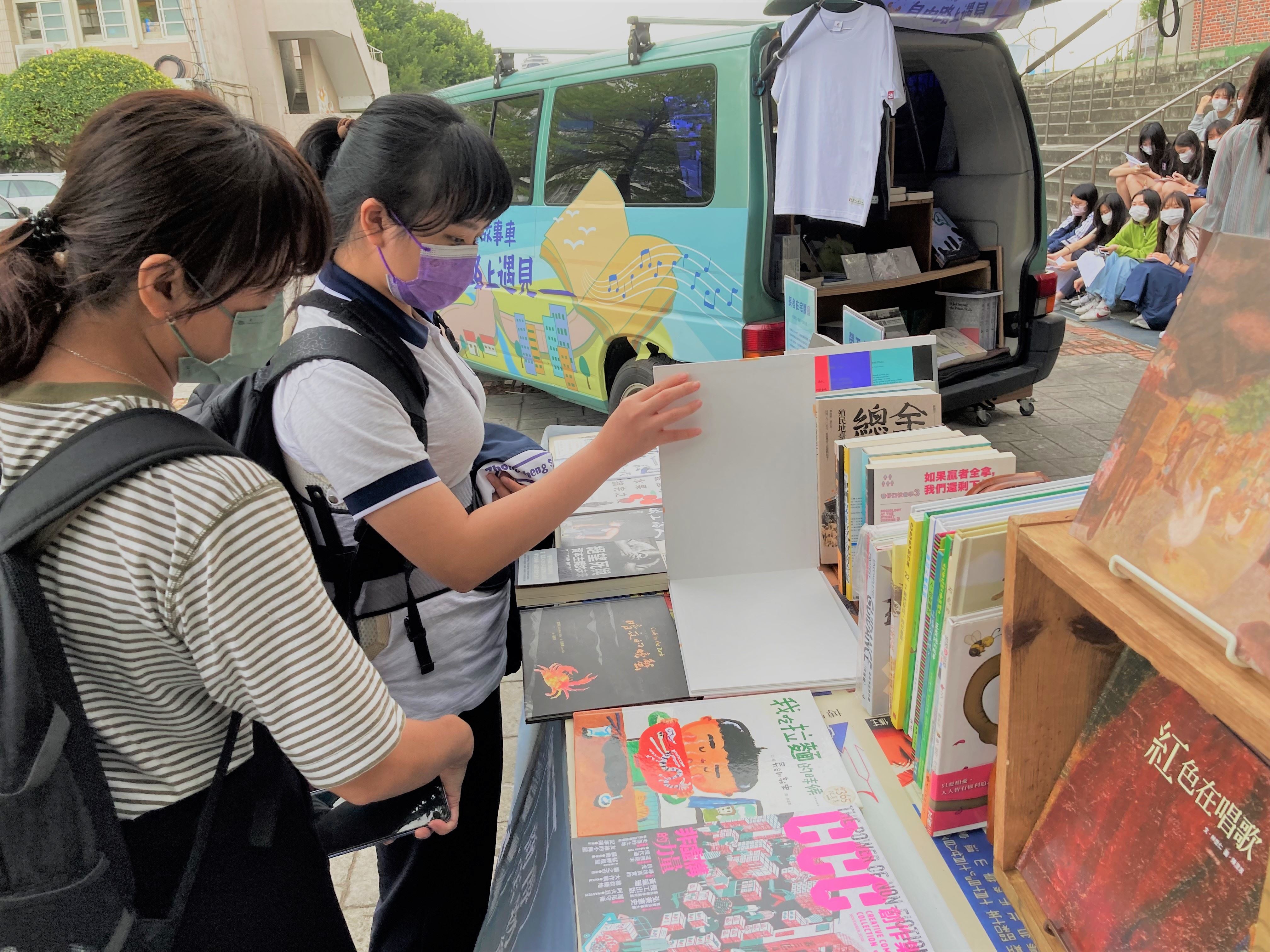 音樂歌謠結束後,蔡焜霖前輩帶著學生走到戶外故事車現場,介紹白恐前輩故事書區《來自清水的孩子》、《走過長夜》,說著前輩如何經歷綠島十年到創辦《王子》雜誌,將臺灣本土漫畫走向發展巔峰,使學生在聽完音樂後能來到人權故事車現場書區,回味蔡焜霖前輩以及歐陽煇美老師訴說的白恐生命故事。現場同學與蔡爺爺互動熱烈,提問踴躍,獲益良多。現場也有超過200本人權圖書以及各社會議題選書,讓現場師生透過閱讀了解過去以及現在臺灣自由民主的發展。