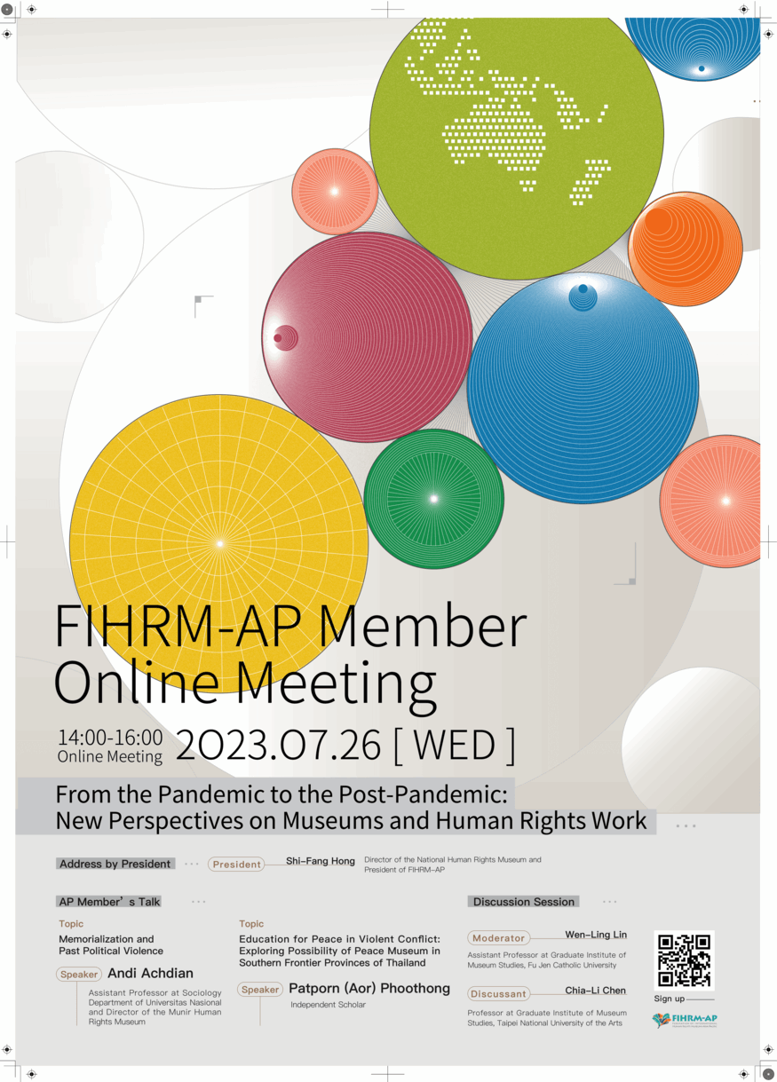 昨(26)日線上會議以「從疫情到後疫情:博物館與人權工作的新展望」為主題,由國家人權博物館館長洪世芳主持,特別邀請印尼國立大學社會學系教授Andi Achdian及泰國研究者Patporn (Aor) Phoothong舉辦線上會議,分享推動人權理念的實務經驗。昨天會議有來自亞洲地區各博物館專家學者及人權團體共58人參加,其中國外學者有泰國、印尼、韓國、日本、澳洲、紐西蘭的博物館專家共11人參與。