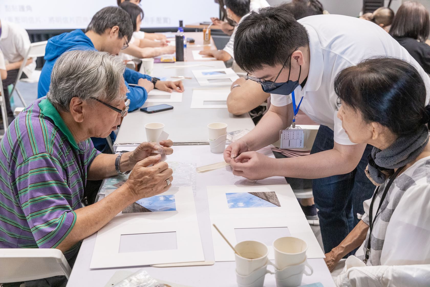 除了專業修護團隊為帶至現場的珍貴文物進行細心的整理與保護,工作坊也邀請「藝流文物維護工作室」專業修復師陳宜柳,為參與者介紹居家文物保存的基本觀念,說明博物館文物的保存維護,也提供實際動手參與的環節,讓前輩及家屬體驗開窗夾裱,延續紙質文物的壽命;修護團隊更為受難者前輩及其家屬們詳細介紹文物捐贈到博物館後的整飭流程,並導覽人權館典藏庫房,一窺人權文物入藏的面貌。