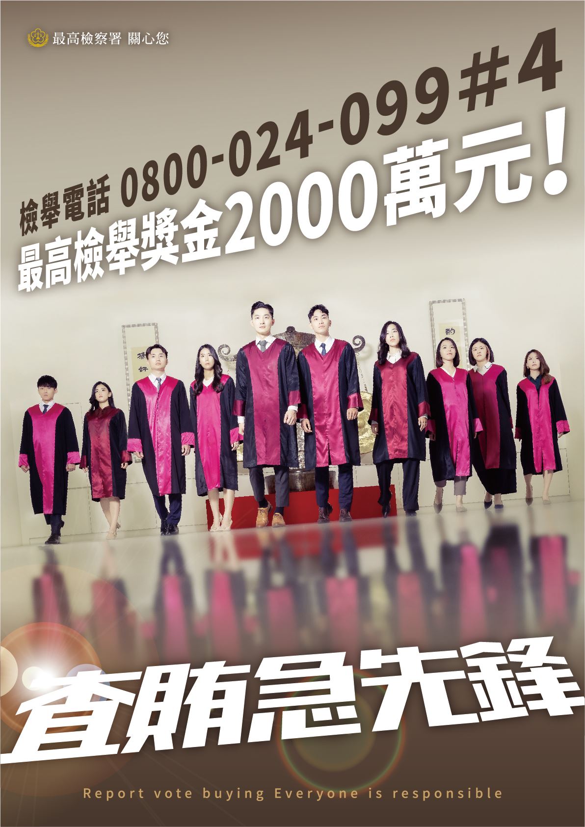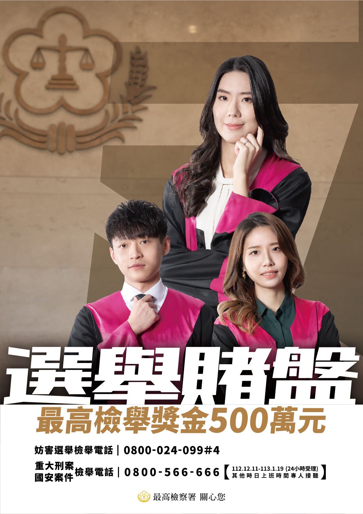 為加強113年第16任總統副總統及第11屆立法委員選舉反賄選宣導,最高檢察署製作「查賄急先鋒」等3款海報,宣導檢舉電話及最高檢舉獎金等反賄資訊,歡迎多加利用。
