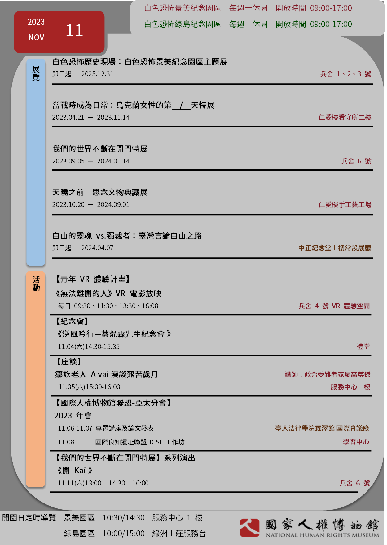 國家人權博物館2023年11月當月活動訊息
