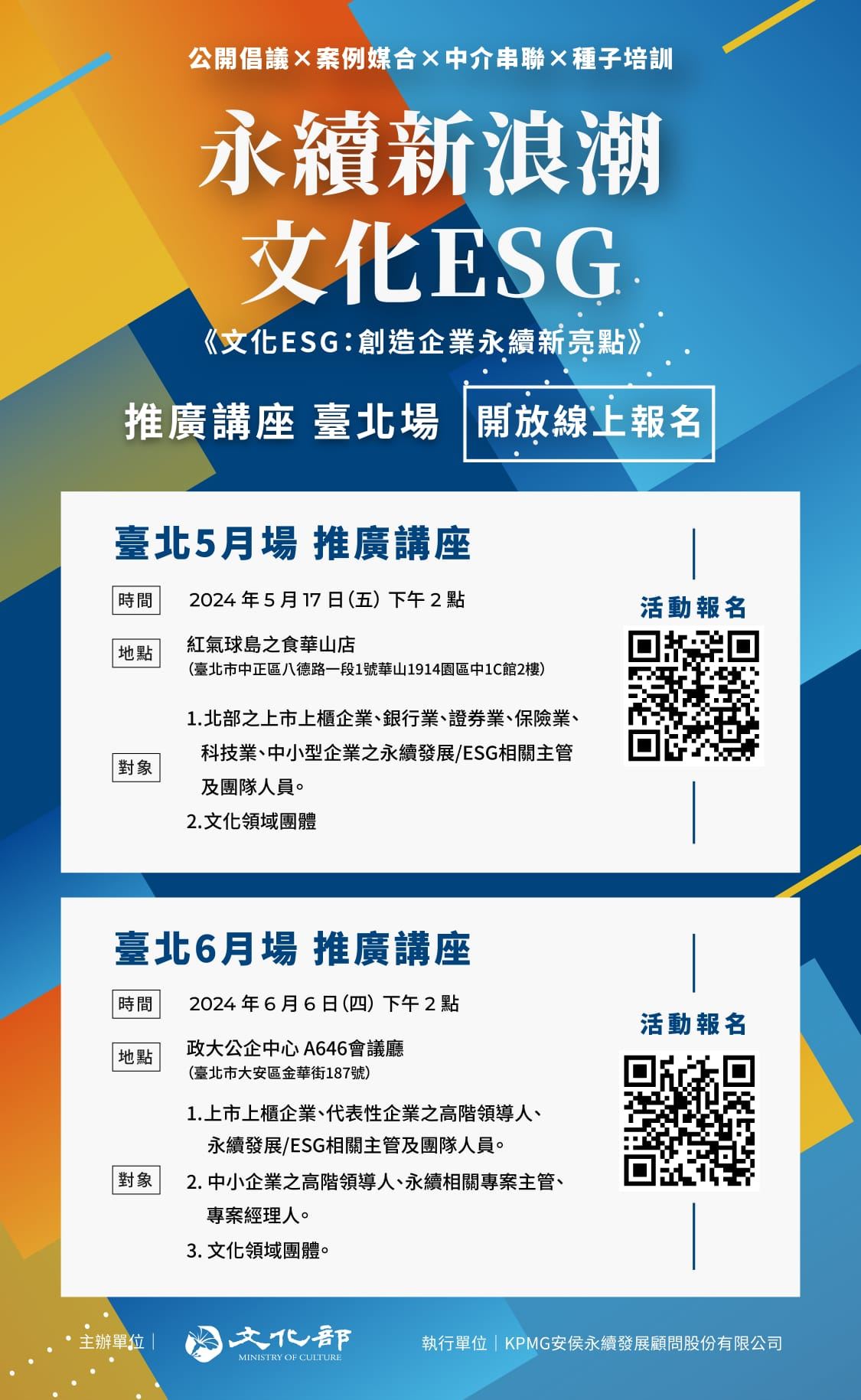 文化部「文化ESG:創造企業永續新亮點系列活動」臺北場活動訊息,歡迎踴躍參與!