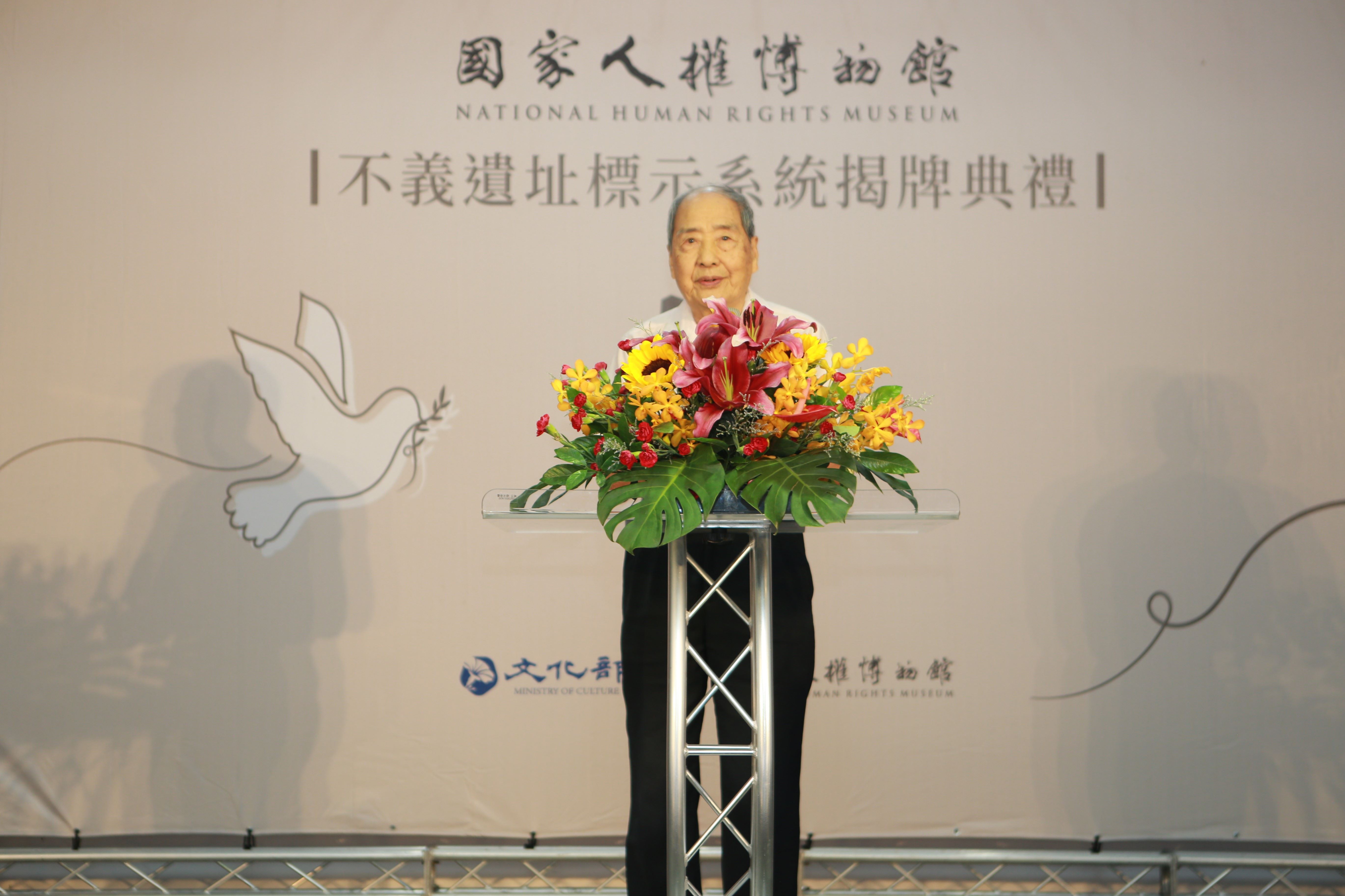 曾關押於新生訓導處的政治受難者張則周前輩,代表參加觀禮的前輩與家屬們致詞。張前輩表示,今日眾多前輩與家屬齊聚綠洲山莊,係為謹記許多前輩拋頭顱、灑熱血爭取民主的努力,才有我們這一代。他期盼下一代能夠效法前輩們的精神,繼續為深化臺灣的人權與民主努力,成為世界各國效法的對象,期待未來能夠建立更為自由、民主、人權、公益、環保、和平的世界。