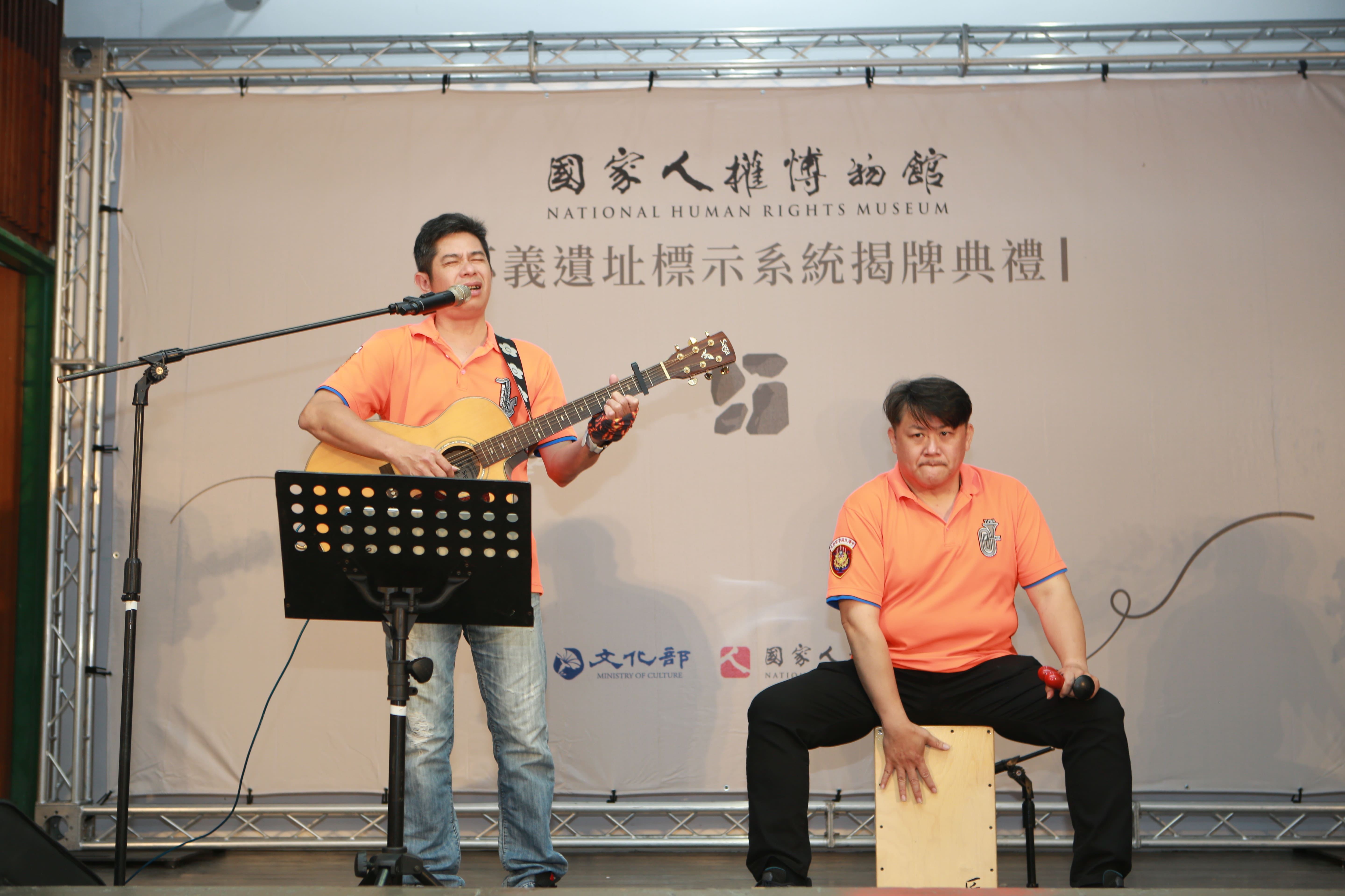 活動開始由陳英志先生(受難者陳賢德前輩之子)及史憲益先生帶來〈黃昏的故鄉〉及〈母親花〉兩首歌曲表演,為今天的揭牌典禮拉開序幕。當年,許多被政府列入黑名單的台灣人無法回臺,在海外臺灣人的聚會中,只能以被列為禁歌、傳達濃烈鄉愁的〈黃昏的故鄉〉一解思念之情;而〈母親花〉一曲則將「在那個時代,有多少母親,為她們被囚禁在這個島上的孩子,長夜哭泣」這段柏楊在綠島人權紀念碑上題的一段話化為樂音,道盡無數母親的心聲。現場前輩們莫不凝神諦聽,在樂聲中回憶往事。