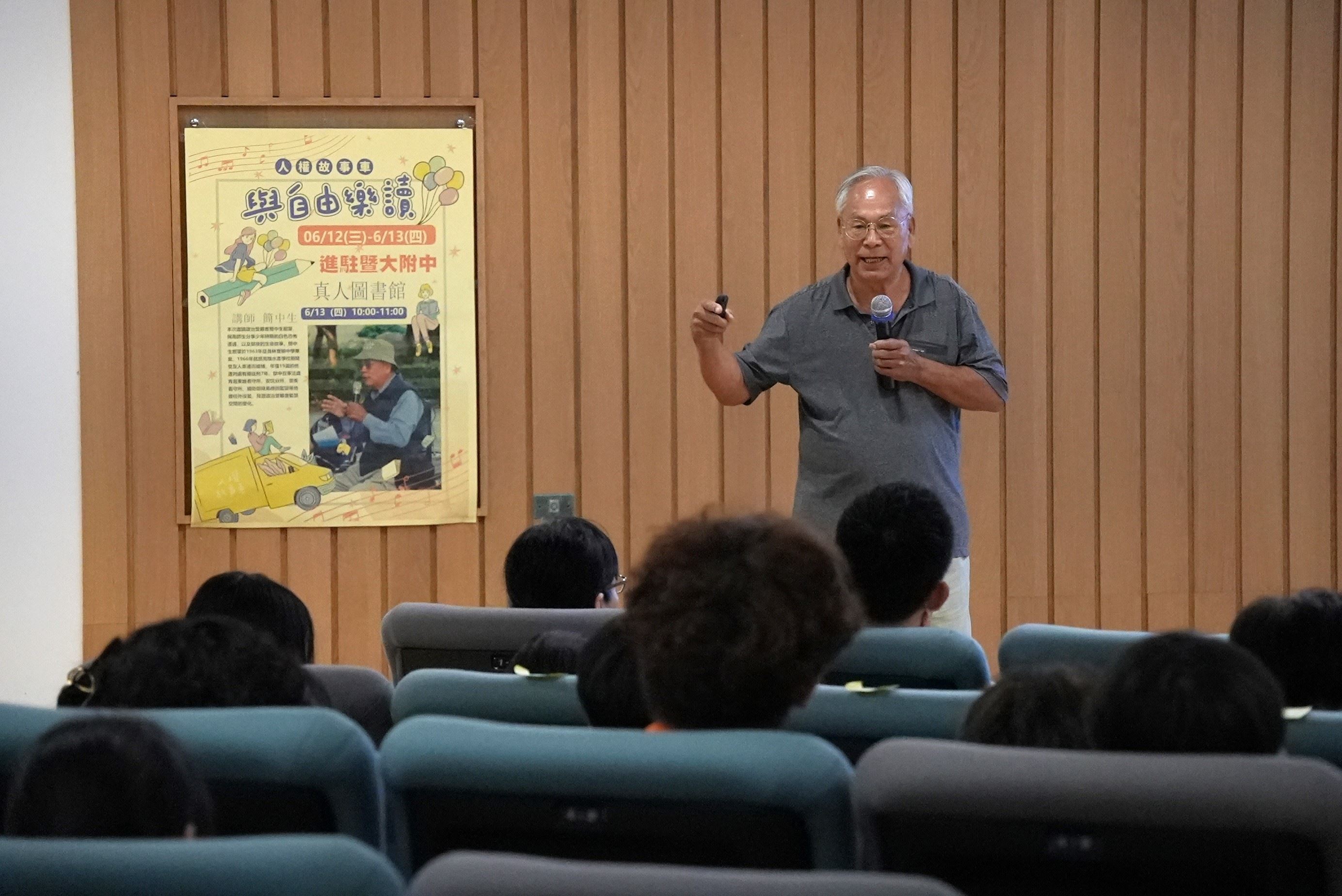 國家人權博物館「2024人權故事車-與自由樂讀」於113年6月12日、13日進駐南投埔里暨南大學附屬高級中學,並在今(13)日舉辦真人圖書館講座,邀請白色恐怖受難者簡中生前輩分享少年時期的白色恐怖遭遇及獄後的生命故事。
