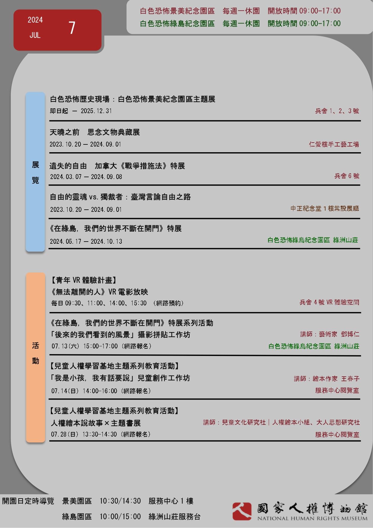 國家人權博物館2024年7月當月活動訊息