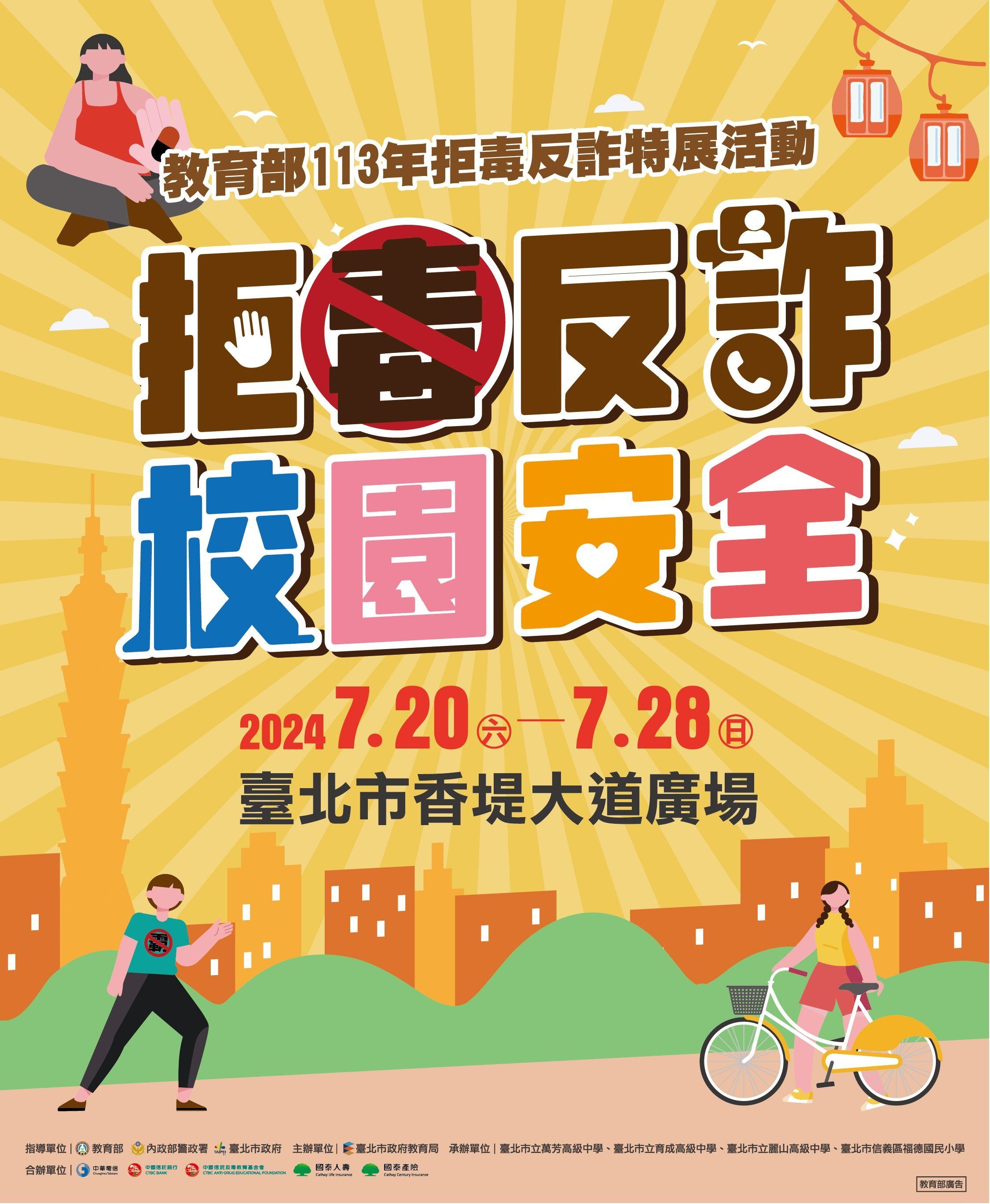 教育部與臺北市政府於7月20日(六)至7月28日(日)在信義香堤廣場舉辦教育部113年拒毒反詐特展活動,今年結合反毒、反詐、反霸凌與交通安全,邊學邊玩邊闖關,有機會獲得限量禮品哦,相關資訊可至教育部防制學生藥物濫用FB粉專查詢!