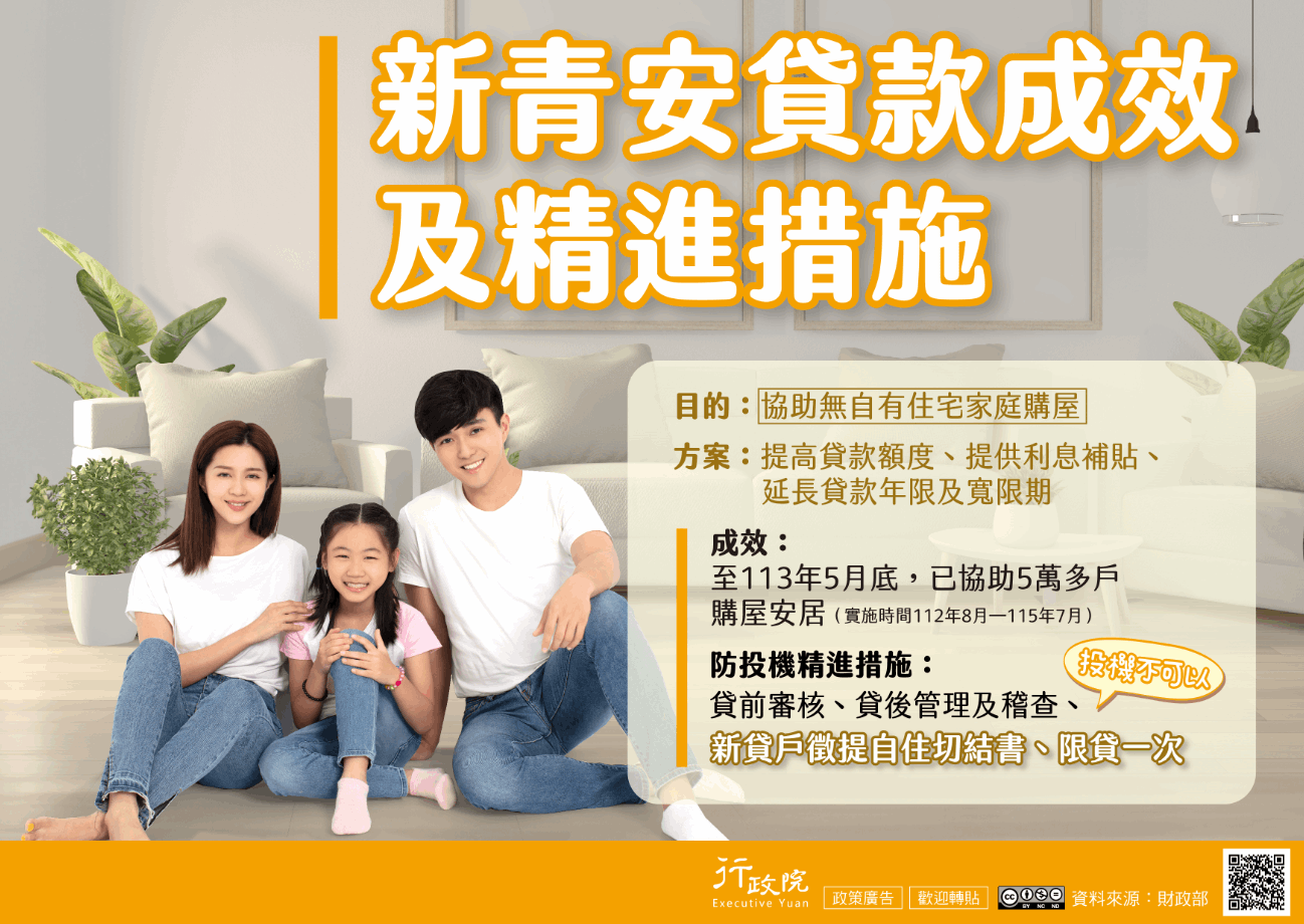 為協助年輕人解決買房問題,新青安貸款政策自112年8月起推出,至今已協助5萬多戶無自有住宅家庭購屋,惟為避免借款人買賣不動產的投機行為,政府再透過修正貸款原則等配套精進措施,期有效促進整體房市健全發展。
