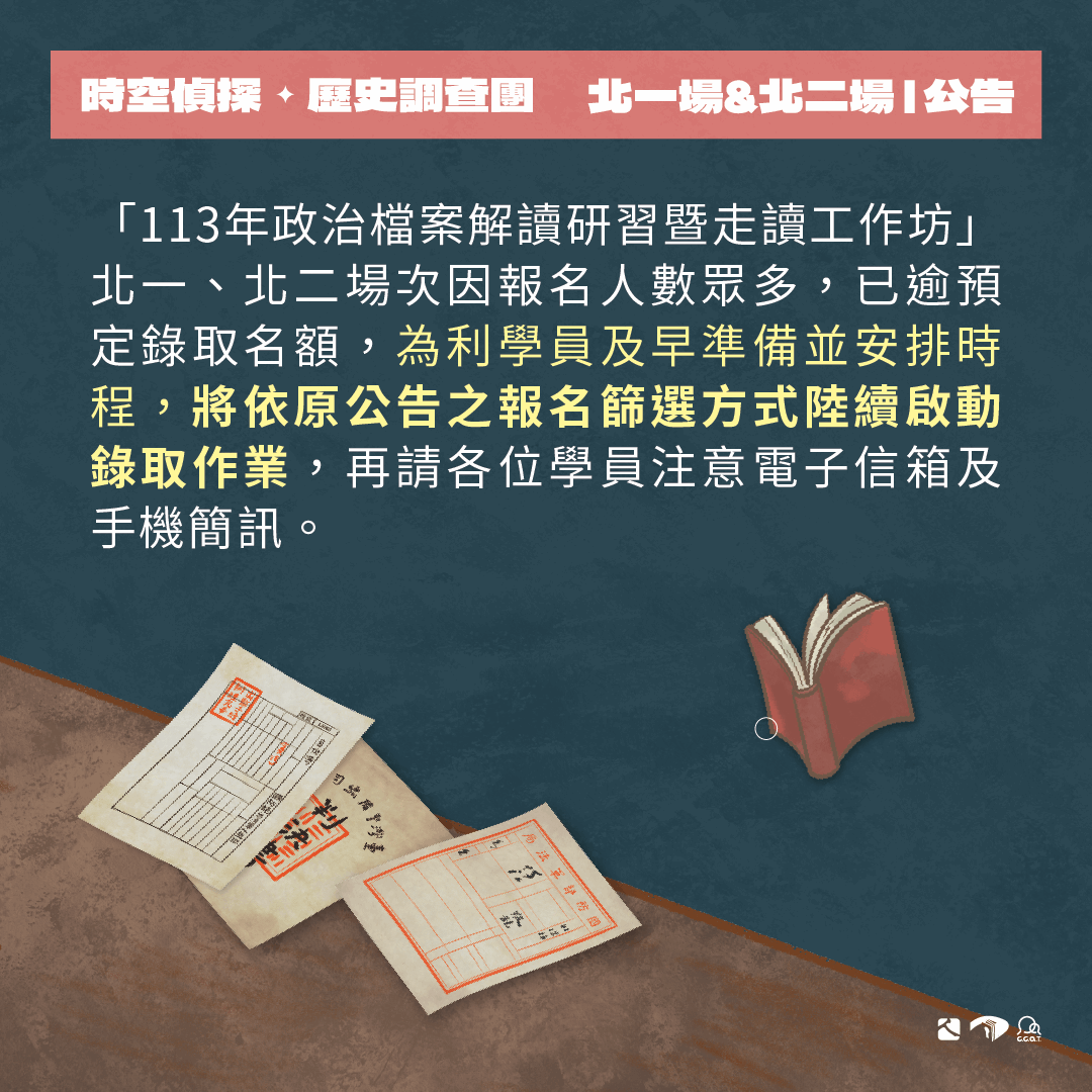 📣「113年政治檔案解讀研習暨走讀工作坊」#北一、#北二場次 因報名人數眾多,已逾預定錄取名額,為利學員及早準備並安排時程,將依原公告之報名篩選方式 #陸續啟動錄取作業,再請各位學員注意電子信箱及手機簡訊!