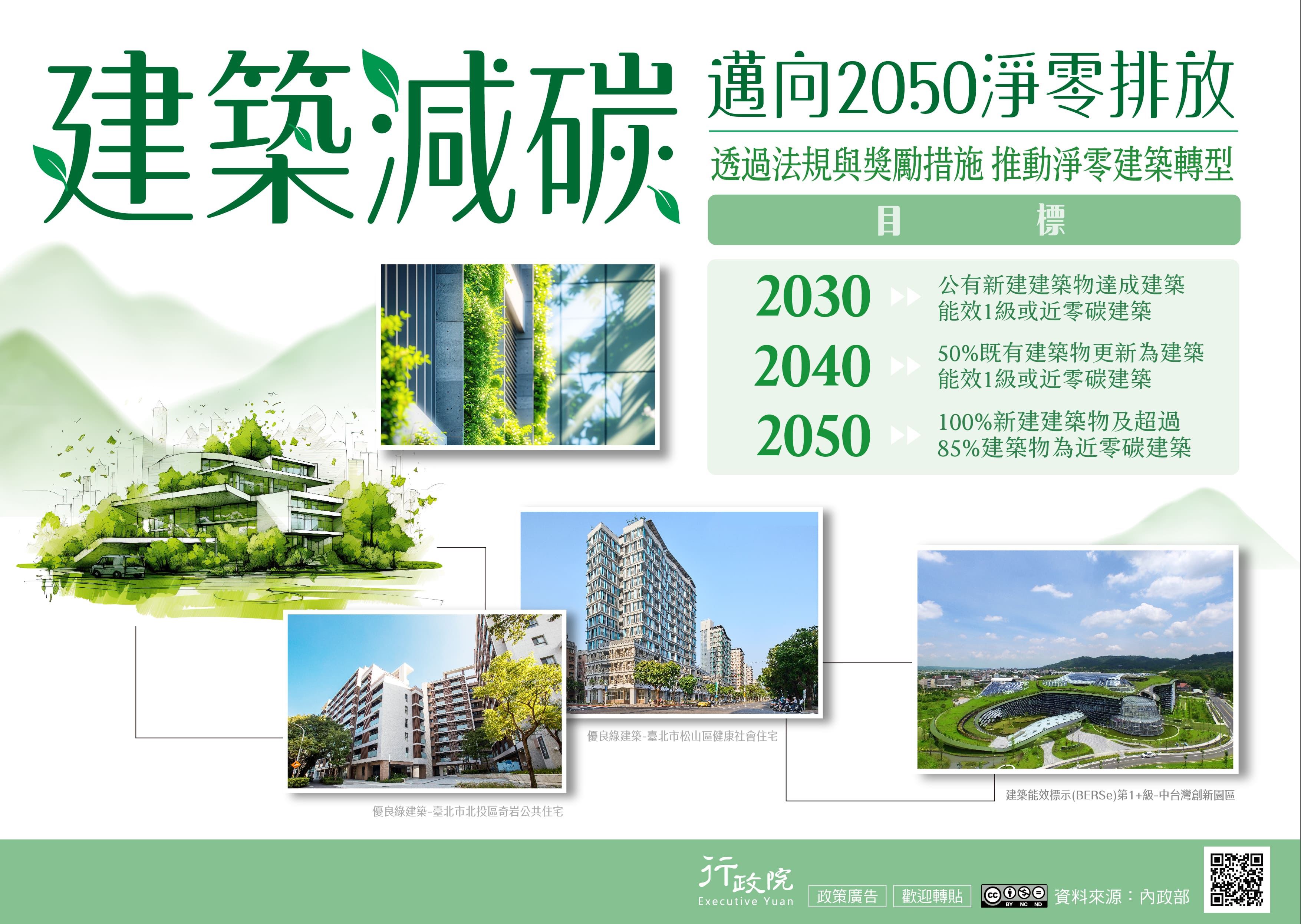 為實現我國2050年淨零排放目標,政府針對建築能效提升方面,提出「淨零建築轉型推動策略」,期透過法規與獎勵措施,加速建築朝低碳轉型方向前進。詳情請參考