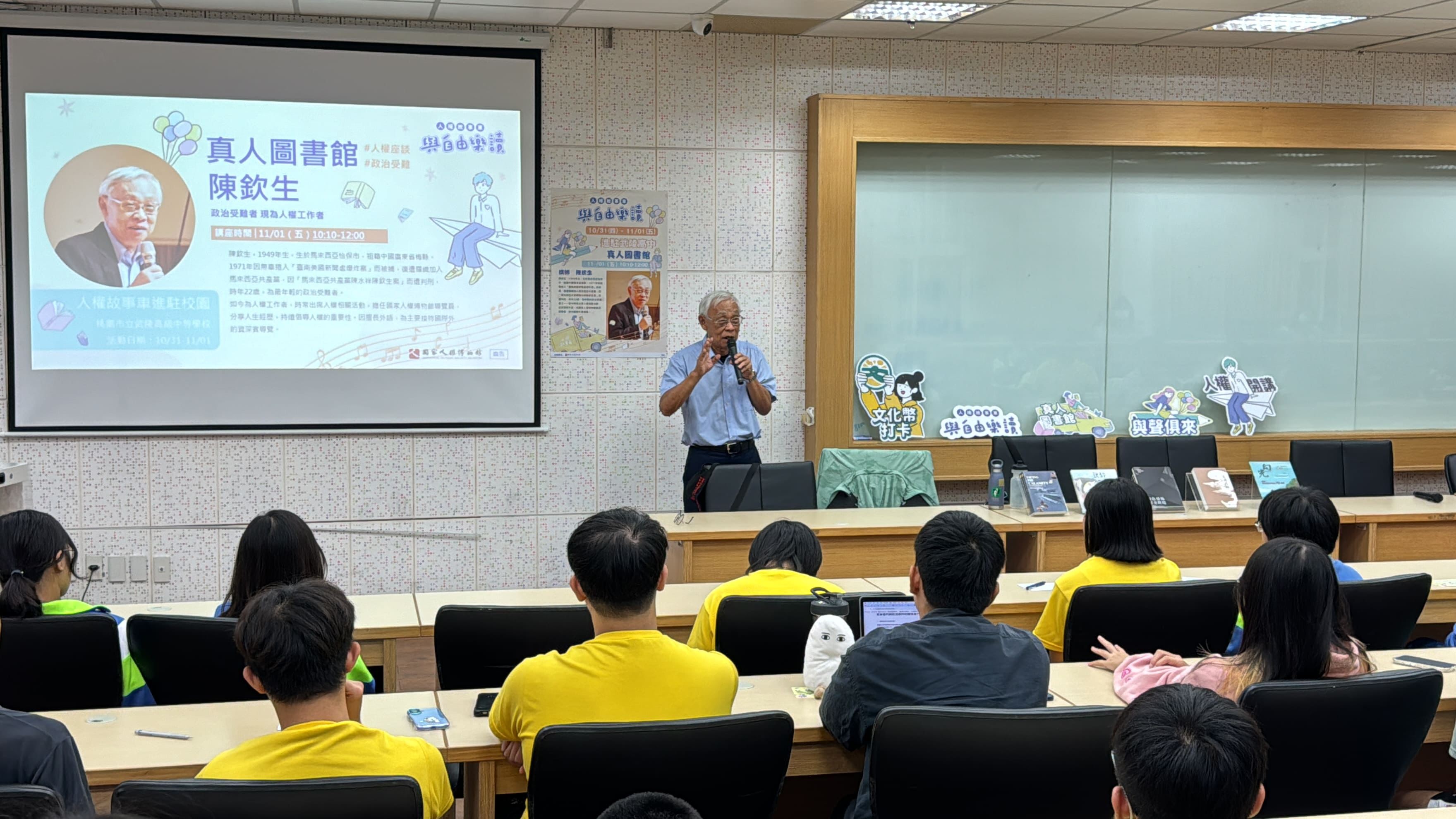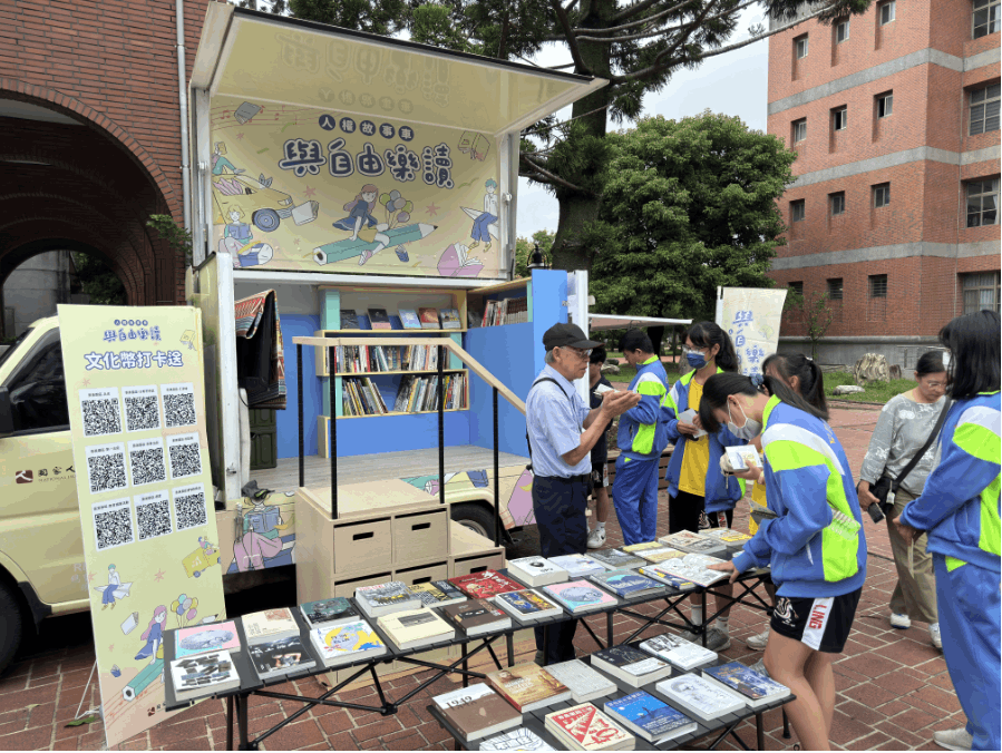 國家人權博物館「2024人權故事車-與自由樂讀」自5月起啟動校園巡迴,載著精選的人權主題書籍進駐校園,以活潑輕快、戶外露營氛圍打造沉浸式的閱讀體驗;11月1日特別進駐桃園市武陵高中,並邀請白色恐怖受難者陳欽生前輩擔任真人圖書館主講人,與高中師生分享年少時期的白恐遭遇,以及出獄後的生命體悟。