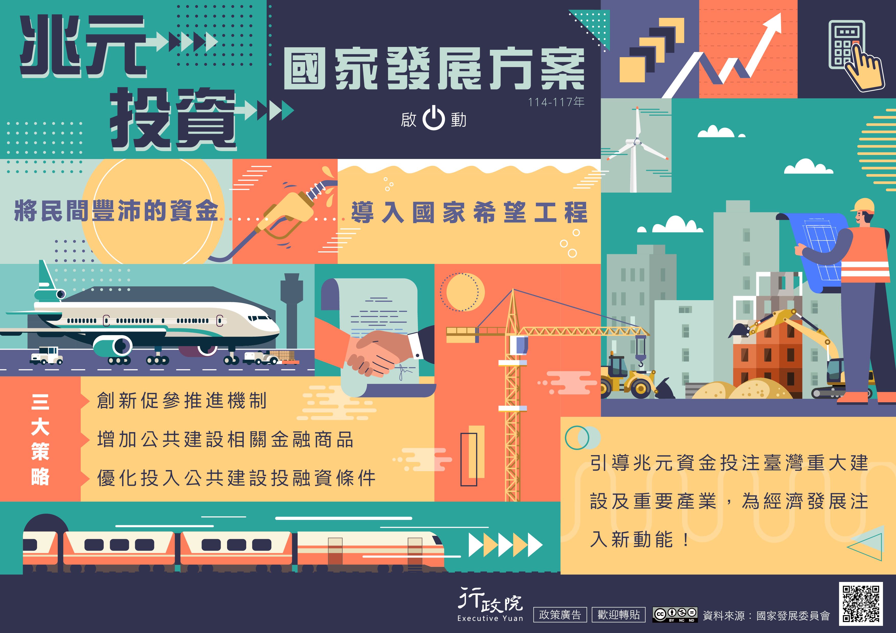 為實踐「國家希望工程」藍圖,政府推出「兆元投資國家發展方案」,期將民間資金導入國家重大建設,為經濟發展注入新動能。詳情請見