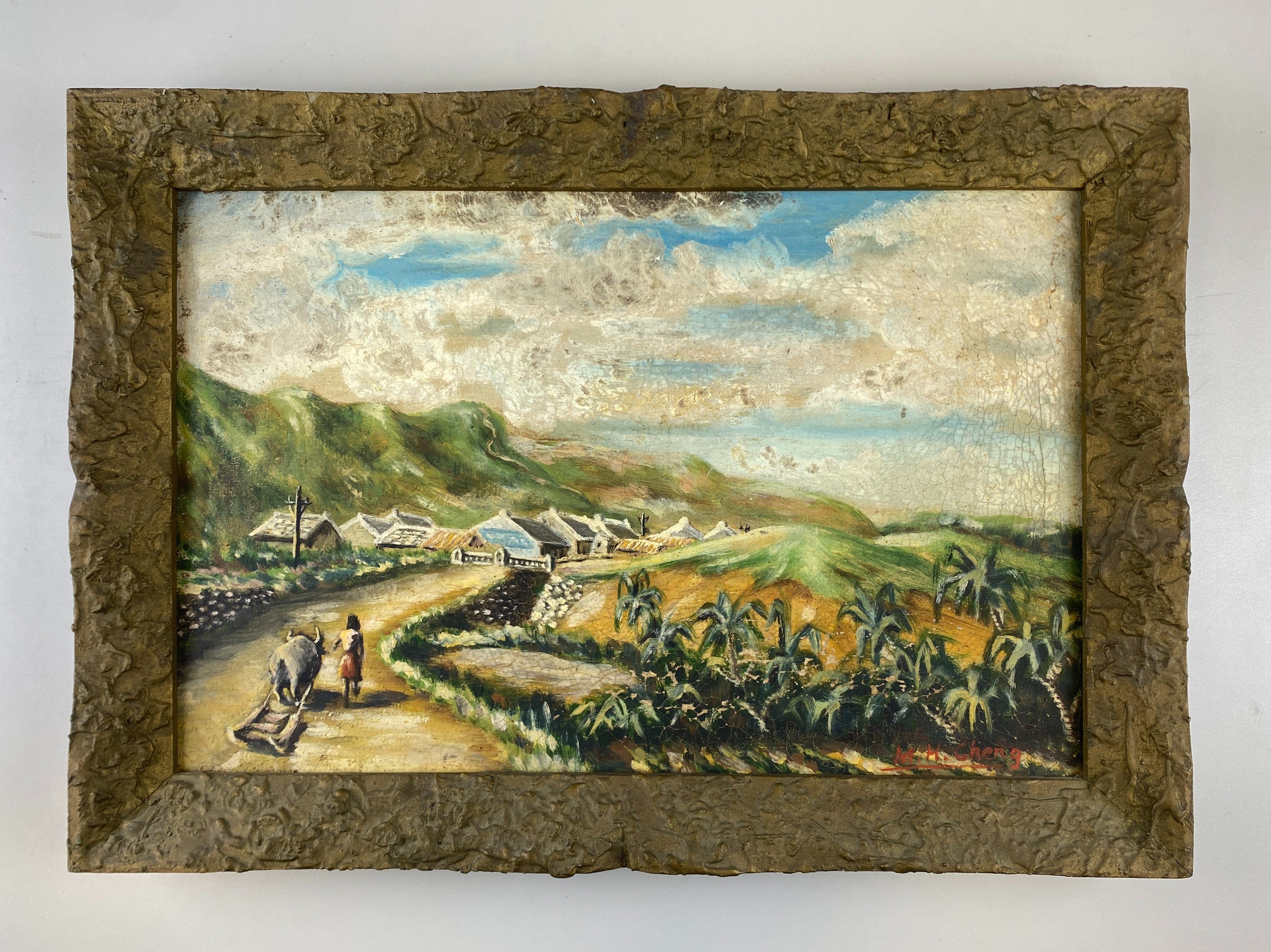 此外,陳顯宗前輩在1962年服刑期滿即將回臺時,還獲得獄中難友許省五、許省六兄弟贈送「少女與牛車」油畫作為留念。畫面視角是從新生訓導處遠眺另一邊大海,蜿蜒小徑上穿著紅色裙子的主角是綠島居民董小姐,水牛拖著綠島特有的農具「拖排」,沿著小徑往前走可以看到當時的公館聚落。這幅油畫是陳孟和前輩於50年代繪製,畫框則是由專長製作海報看板的許氏兄弟,就地取材手工製成。此件作品不僅記錄當時新生與綠島居民以物易物的庶民生活樣貌,以色調明亮的田園景色象徵新生們迎向未來的堅毅精神,更承載了新生們在克難環境中互相扶持的情誼。