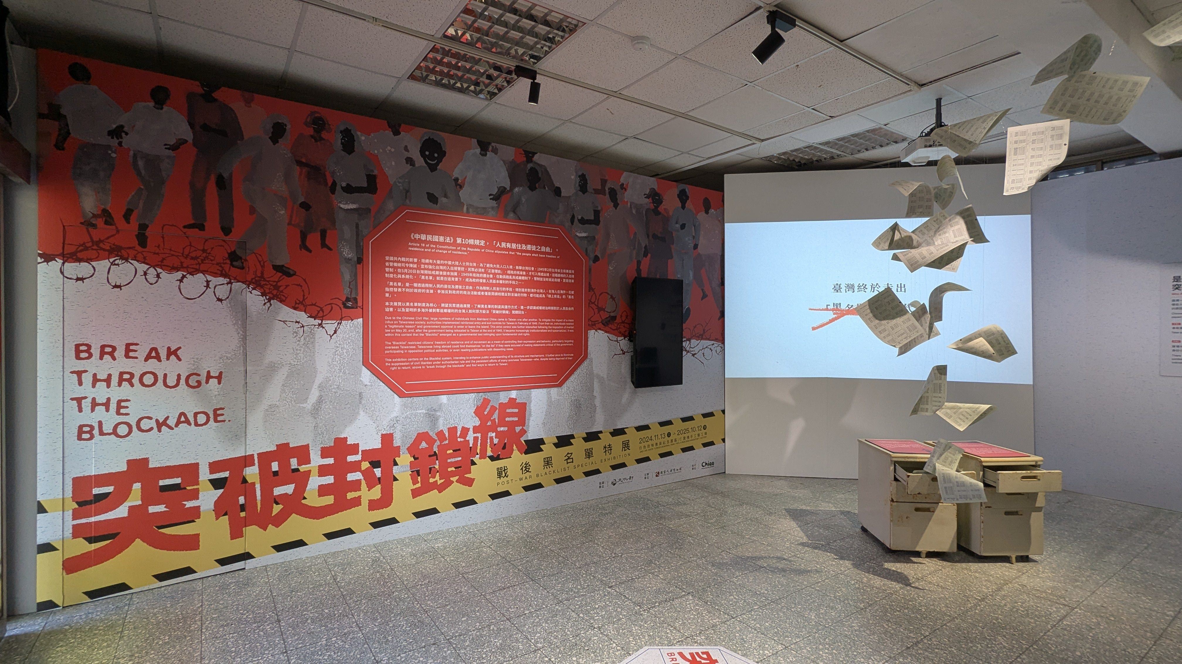 《突破封鎖線 戰後黑名單》特展,轉譯真實人物故事及研究成果,呈現威權統治時期,政府以國家安全為由,在外交與情治體系配合下,交織「黑名單」巨大網羅,限制國人出入境的權利、控制人身自由的歷史。展覽結合歷史情境及互動裝置,提供沉浸式的觀展體驗,期待觀眾藉此反思民主自由的珍貴與可能消失的危機,進而共同守護。
