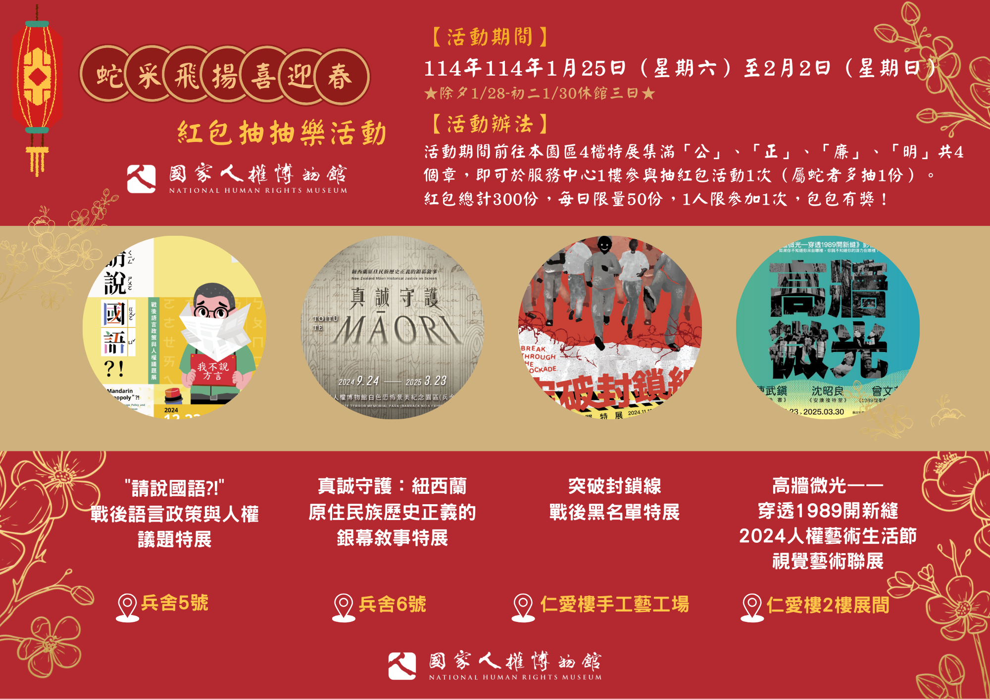 為迎接2025農曆春節,國家人權博物館於小年夜(1月27日)及初三(1月31日)將特別開放參觀,歡迎民眾相招到園區走春,除可一次盡覽5檔精彩展覽,集滿4個特展印章即抽紅包、贈好禮,還可參加「Muse大玩家—環遊知識島」好康活動;在園區使用文化幣打卡即送限量好禮,文化幣消費還享有各式優惠。此外,歡迎民眾報名參加1月25日至29日安康接待室定時導覽活動,透過在地視角,認識藏在安坑山谷中重要的人權歷史場域。