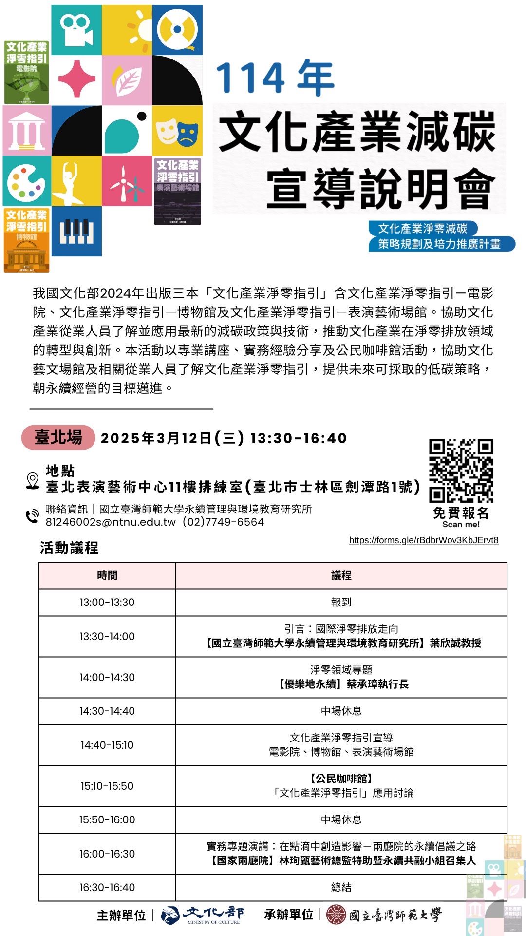 國立臺灣師範大學辦理文化部「114年文化產業減碳指引說明會 」,歡迎踴躍參與