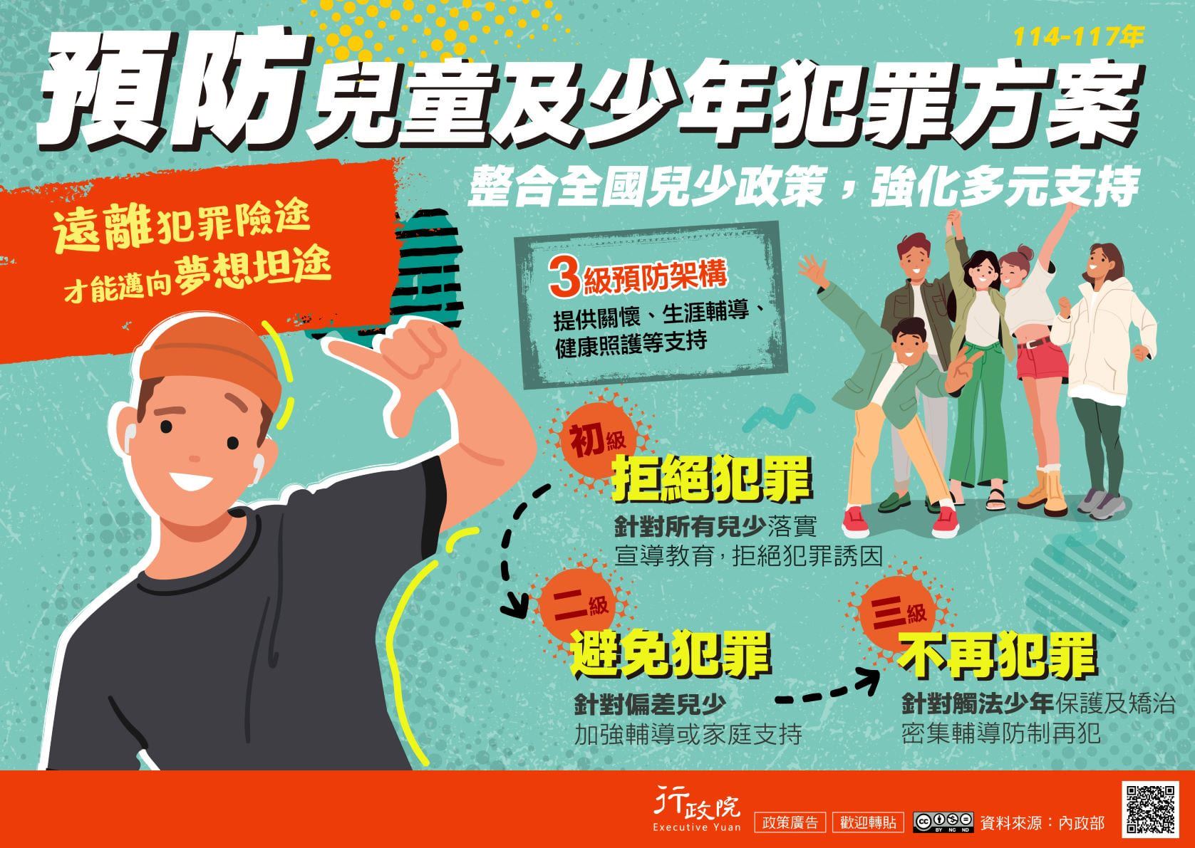 為因應兒少偏差行為及犯罪態樣改變,政府核定更新「預防兒童及少年方案」,透過3級預防策略,強化提供關懷、生涯輔導、健康照護等支持,預防及減少兒少發生犯罪行為。詳情請見「
