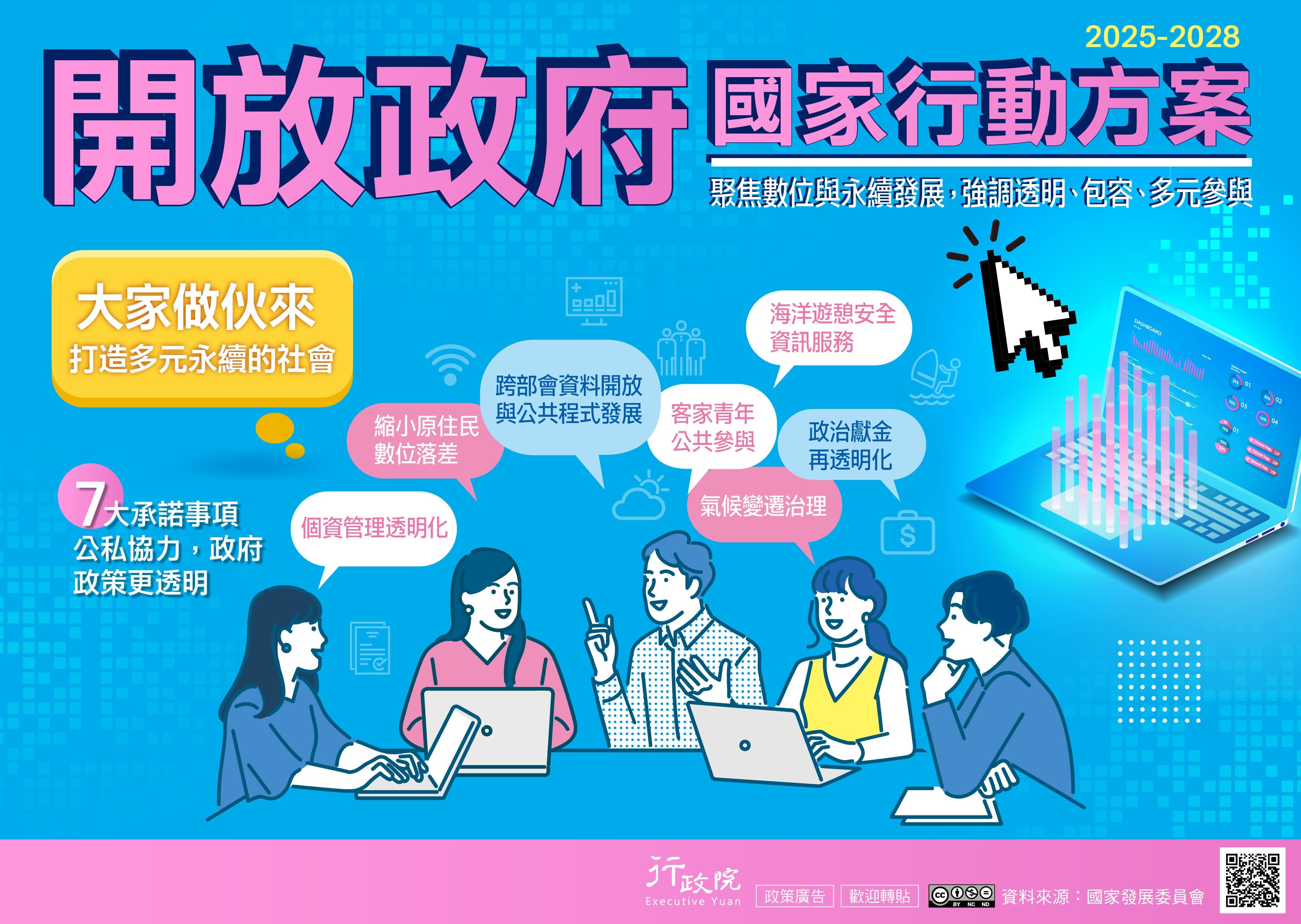 為持續深化民主素養,讓臺灣成為國際社會可靠的夥伴,政府再發布新一階段行動方案(2025-2028),透過公私協力機制,強化數位技術應用、擴大多元公民參與,並深化政策透明度。詳情請見「