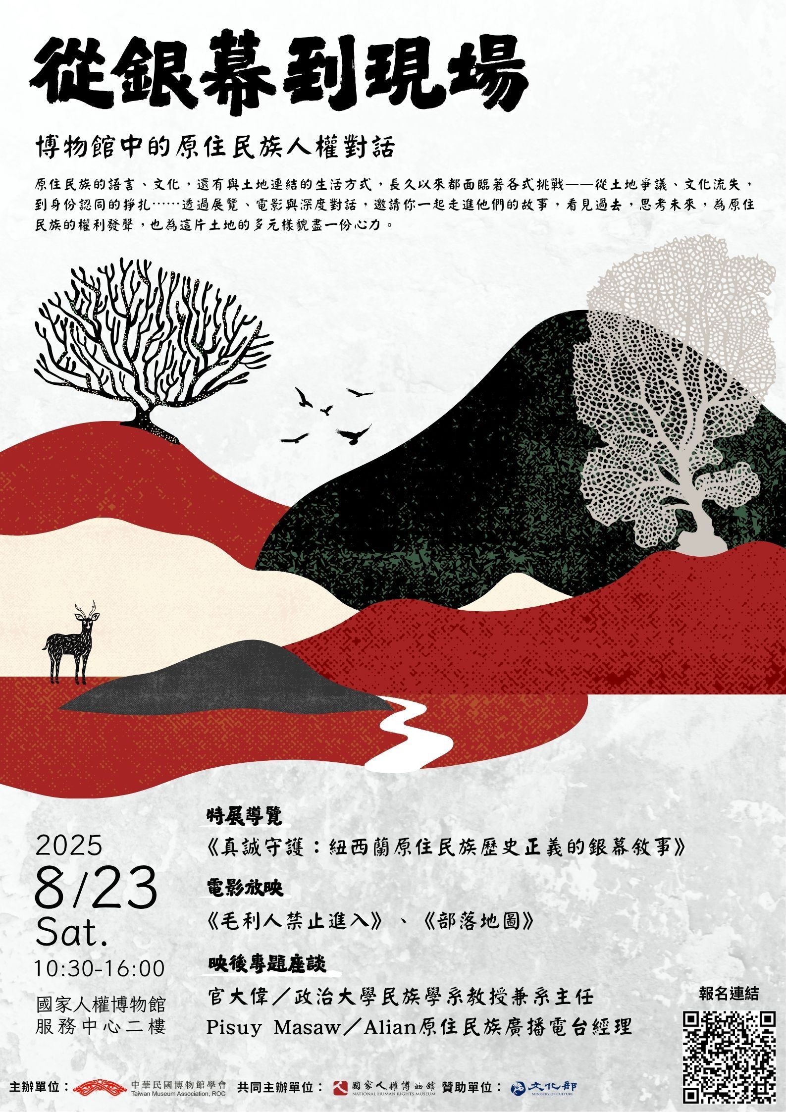 這個夏天,我們邀請你一起參與「從銀幕到現場:博物館中的原住民族人權對話」透過展覽、影像放映與深度對話,走入原住民族的歷史經驗和故事,看見他們如何面對殖民、抗爭與自我認同,思索臺灣與世界原住民族所共享的權利議題。