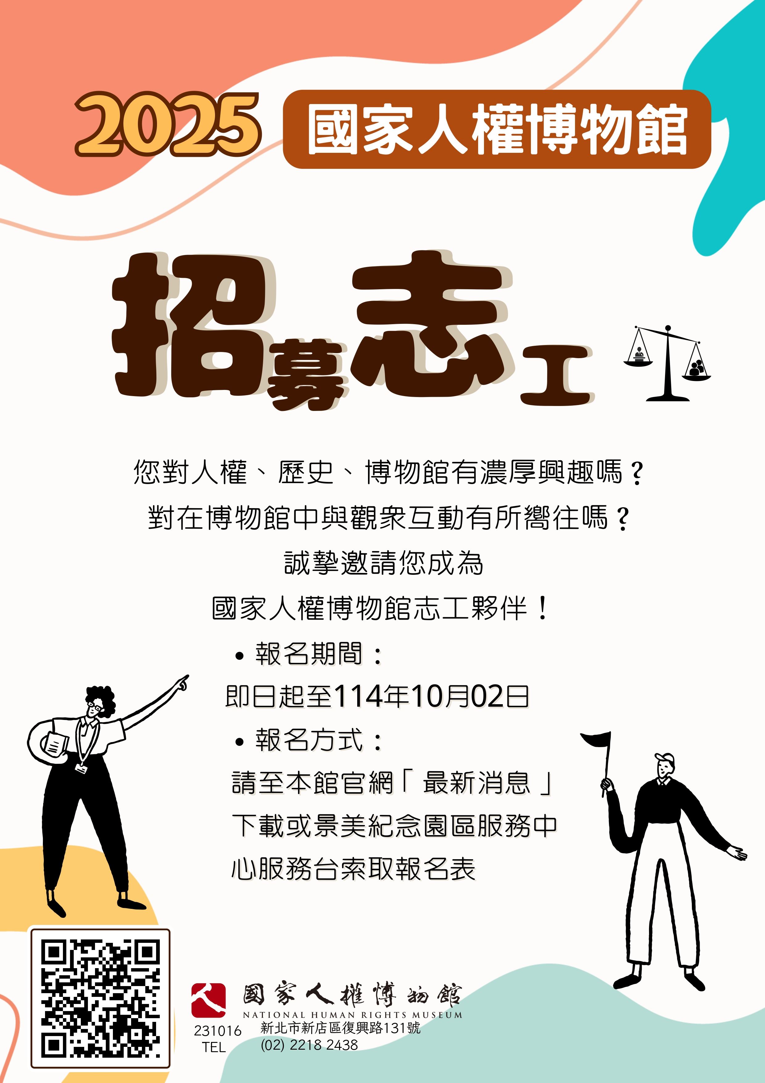 【紙本】至本館官網下載或親至園區服務中心1樓服務台領取「114年度國家人權博物館白色恐怖景美紀念園區志工報名表」,郵寄至「國家人權博物館」展示教育組(地址:23150新北市新店區復興路131號) (洪瑜均小姐收)