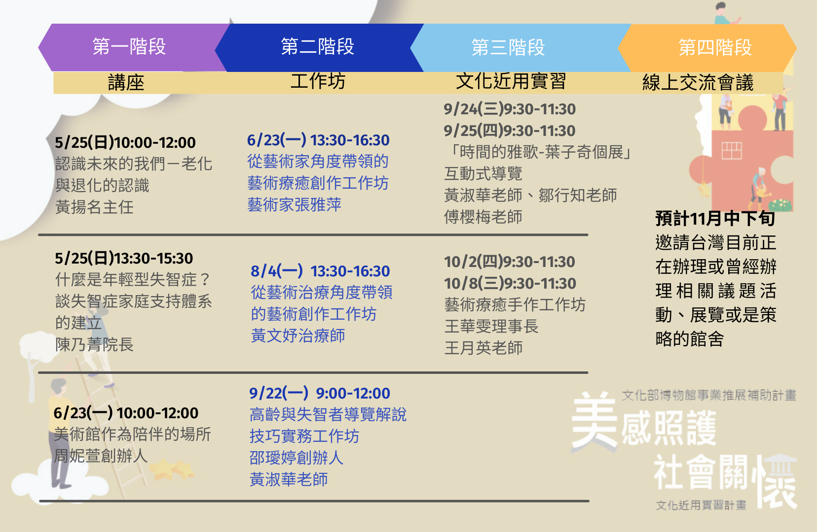 持續辦理「藝術介入高齡失智」 培力課程,邀請具備豐富理論與實務經驗之專家授課,協助學員建立規劃適切學習活動之能力,並深化其對長者陪伴與服務需求之認識,培養更多具備實務操作能力之人才。課程目前進行到第二階段第三堂課及第三階段,第三階段將與失智據點合作,讓學員透過實地參與,親身觀察並與長者互動,結合導覽技巧與療癒性手作活動,實際體驗藝術介入在高齡照護現場的應用與挑戰,從中學習實務操作與溝通方法,為未來推展高齡友善博物館奠定基礎。相關資訊可參考附件及