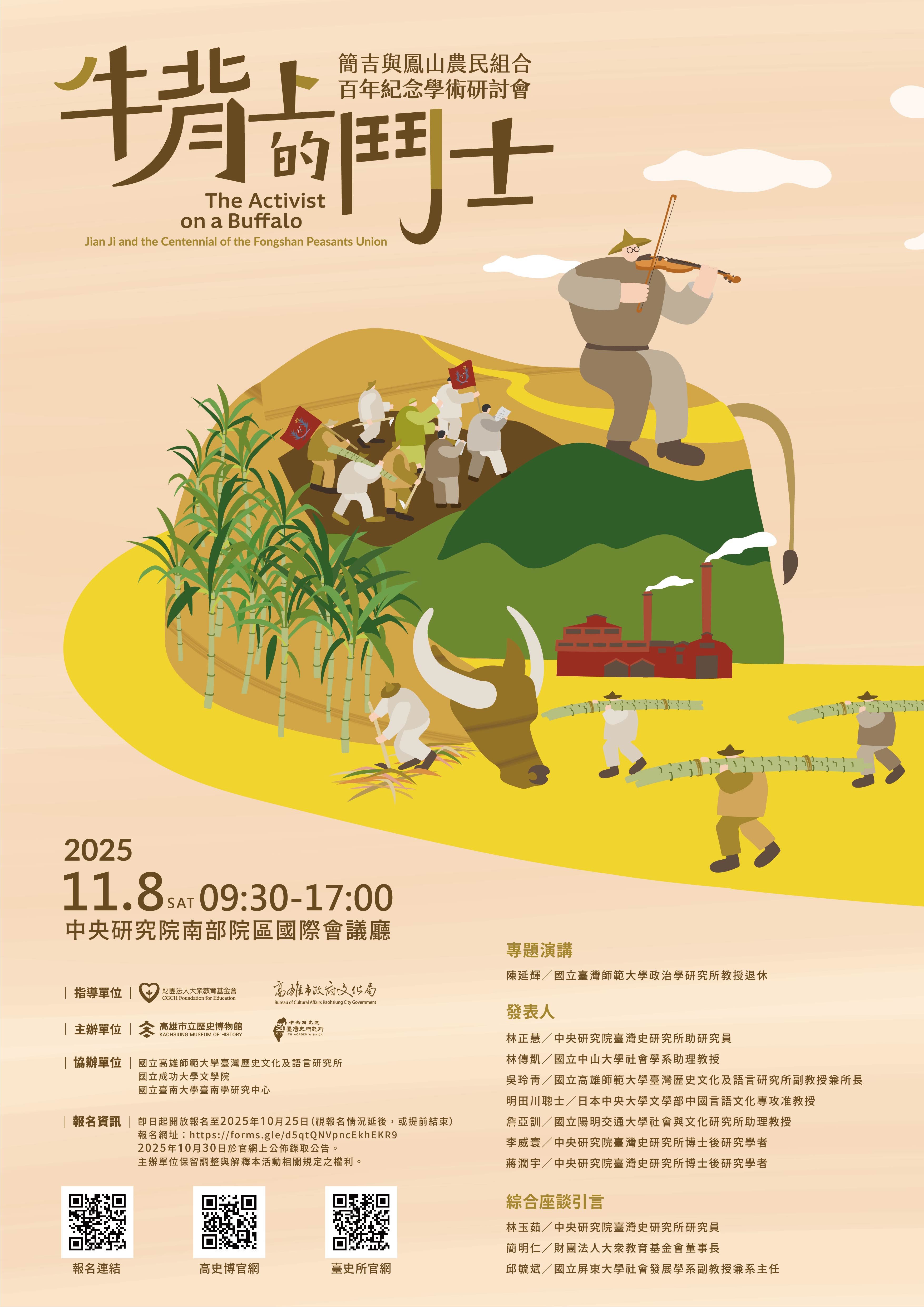 將於114年11月8日在中央研究院南部院區國際會議廳聯合舉辦「牛背上的鬥士——簡吉與鳳山農民組合百年紀念學術研討會」,期透過學術專業深入探索農民運動中發起者、參與者、同時代的其他見證者所揭示的思想與行動,進而促使當代民眾對日治時期臺灣農民運動史及社會運動史的認識,提升社會對於農民教育的重要性及其歷史意涵的認知。