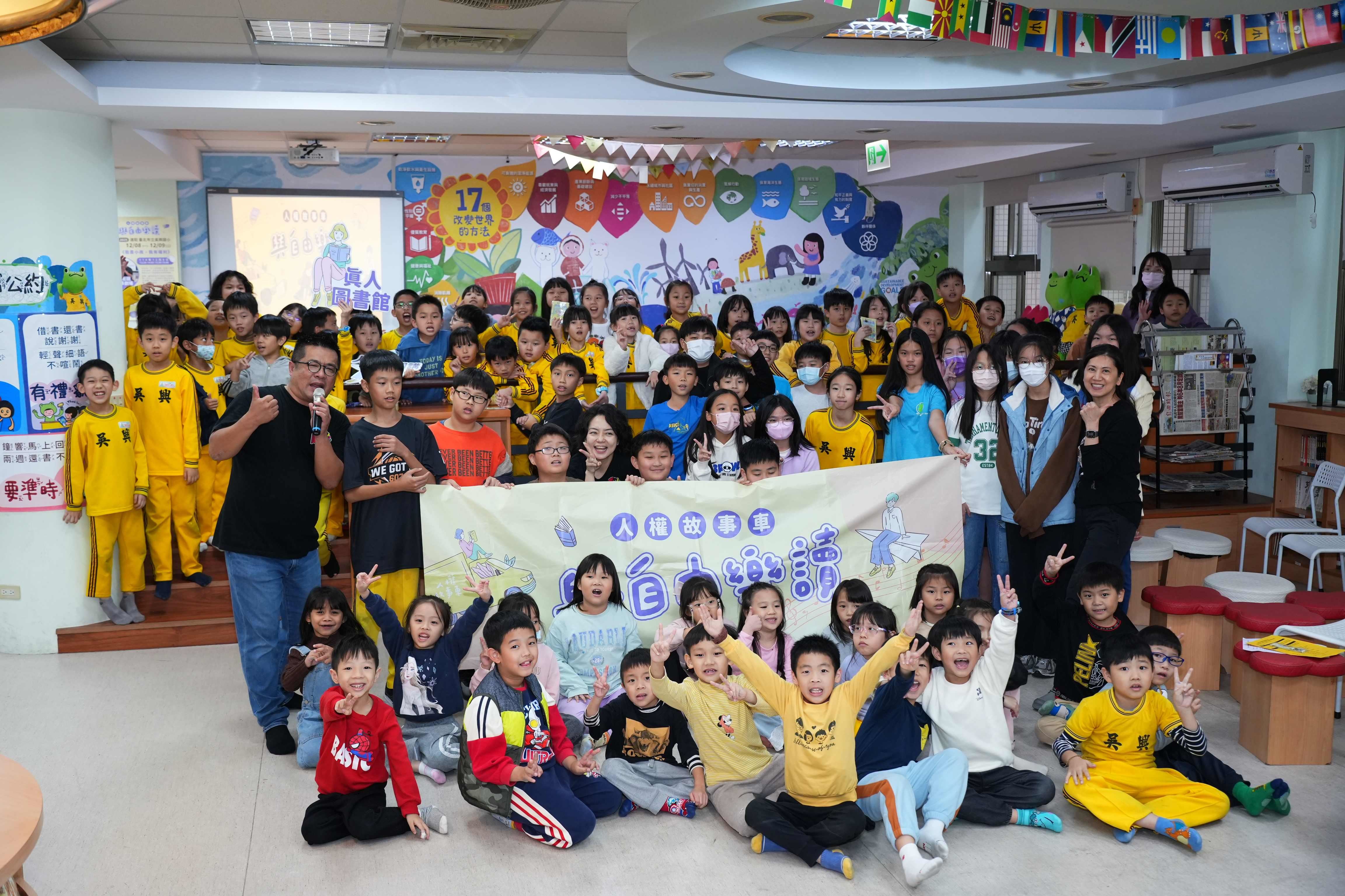 為引導國小學生認識人權議題,本次活動邀請「陸爸爸說演故事劇場」,藉由說演故事輕鬆有趣的互動,以及導讀人權繪本《我是小孩,我有權利》、《希望小提琴》及《說好不要哭》,將人權理念轉化到校園與家庭的具體情境,引發學生興趣。中低年級學生在故事引導下,學習「勇敢表達想法」與「尊重別人」;高年級學生則透過情境提問,思考如何在日常生活中實踐尊重與包容。