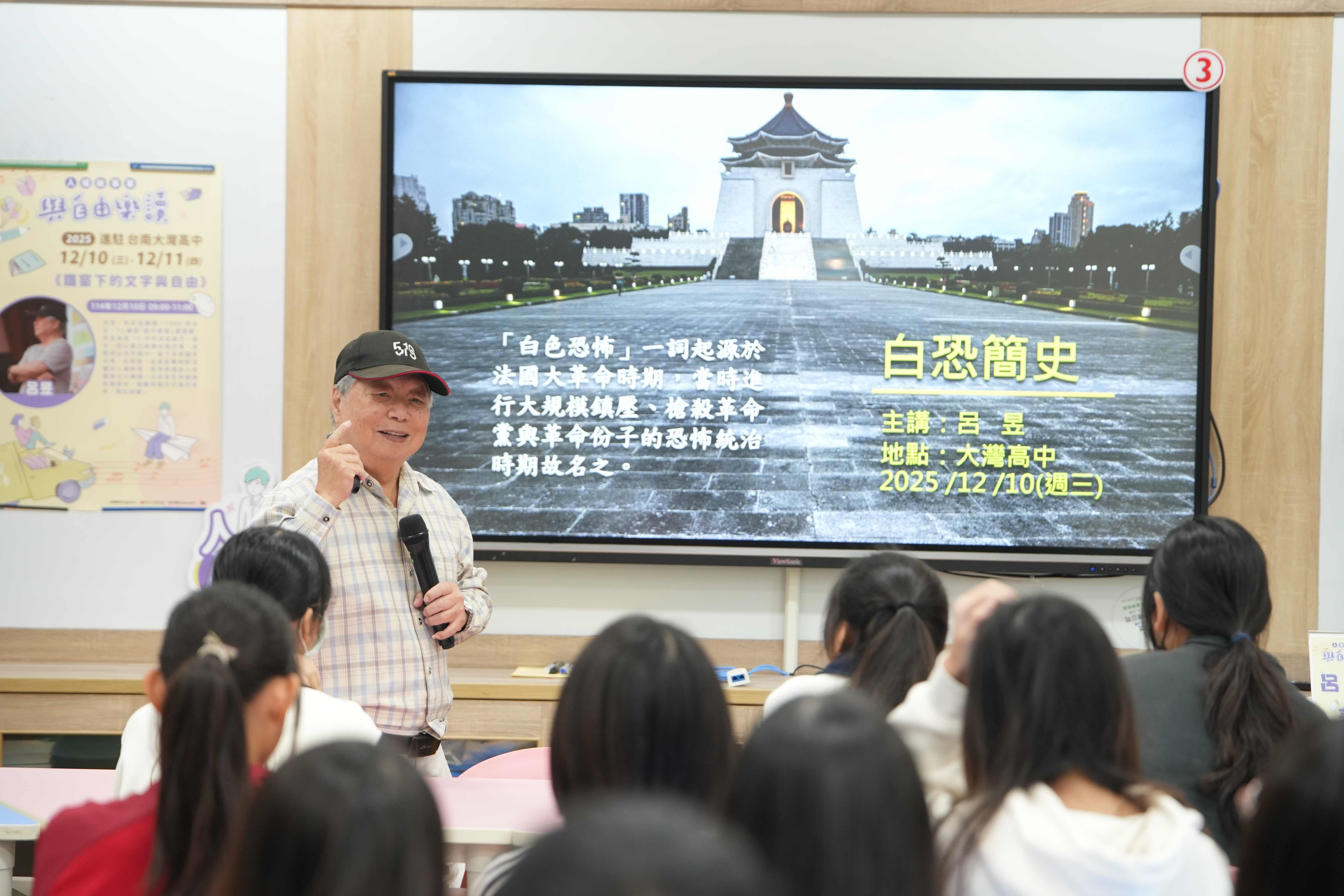 國家人權博物館「2025人權故事車-與自由樂讀」校園巡迴活動於12月10日至11日進駐臺南大灣高中,10日並舉辦「真人圖書館」,邀請白色恐怖政治受難者、同時也是獄中文學代表作家呂昱前輩,透過他的生命故事與文學創作經驗,引導師生認識臺灣人權發展的歷史,啟發思考民主、自由與人權的意義。