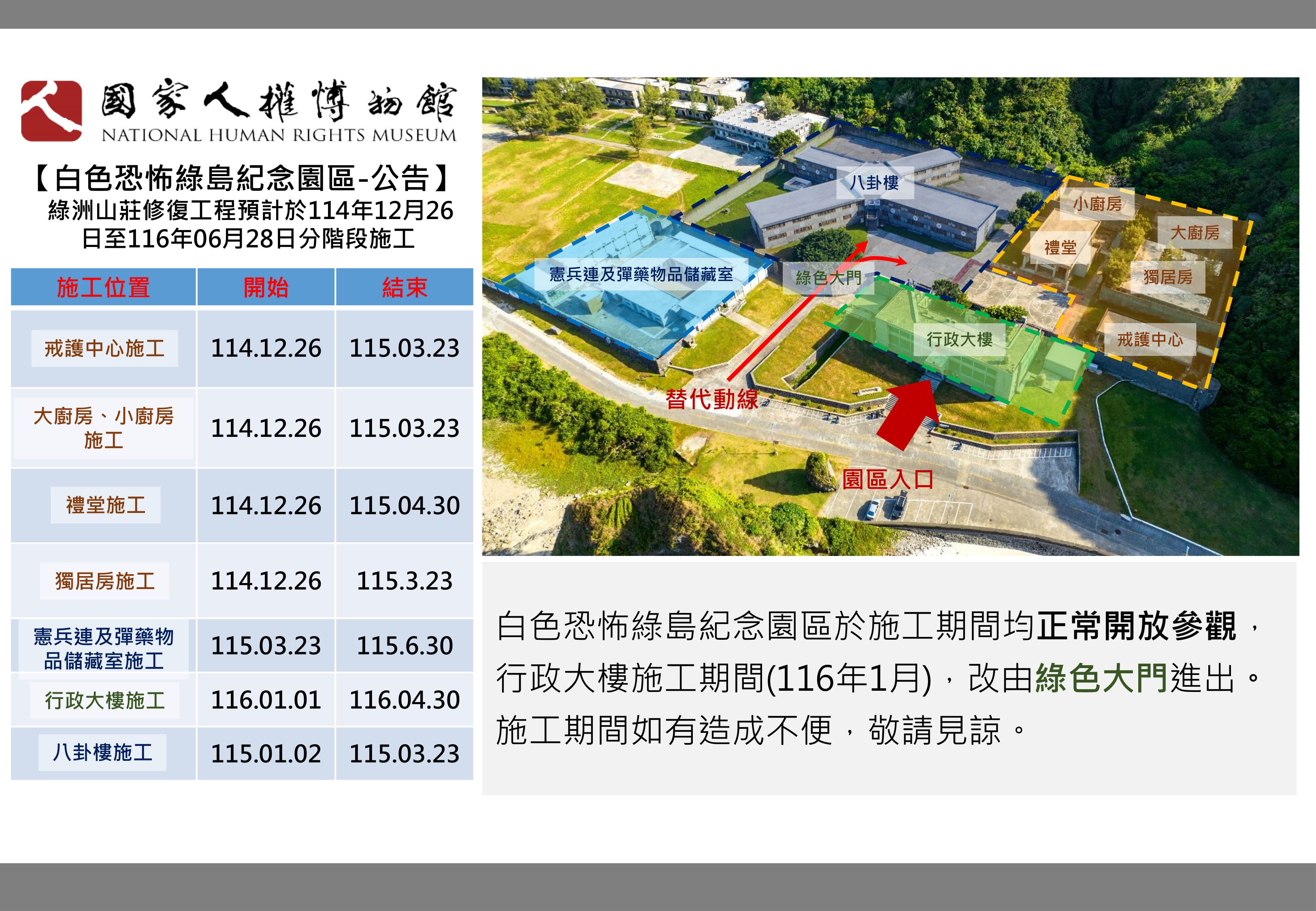 綠洲山莊修復工程預計於114年12月26日至116年06月28日分階段施工,白色恐怖綠島紀念園區於施工期間均正常開放參觀,行政大樓施工期間(116年1月),改由綠色大門進出。施工期間如有造成不便,敬請見諒。